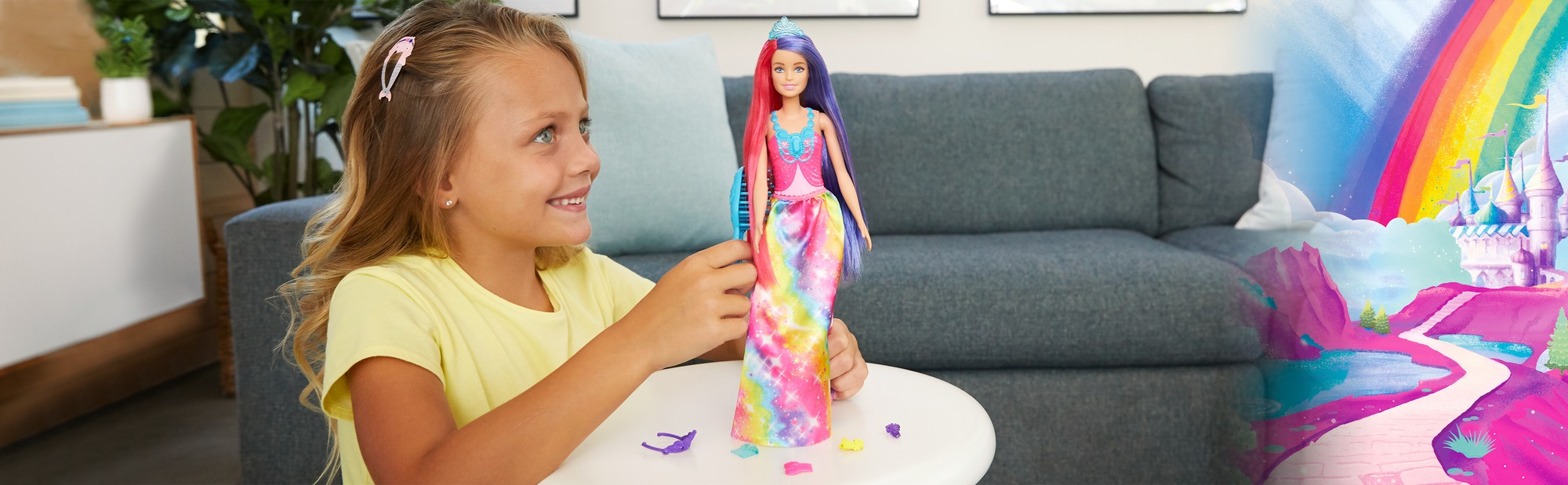 Deze Dreamtopia prinsessenpop met haar sprookjesachtige look en extra lange haar in twee kleuren vraagt om de mooiste verhalen en de spannendste stylingavonturen! Jonge stylisten kunnen het lange, kleurrijke haar van deze Barbie pop borstelen en daarna me