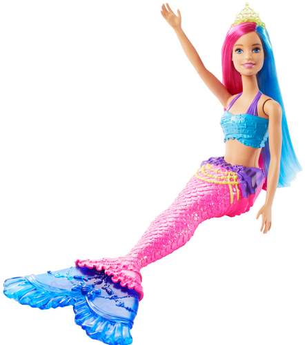 Barbie Dreamtopia zeemeerminpoppen hebben alle kleuren van de regenboog en inspireren kinderen om de mooiste verhalen te vertellen! Deze Barbie zeemeerminpop neemt een duik in het diepe in haar kleurrijke topje en sprankelende staart met fantastische details. Een felgekleurde diadeem in haar lange roze en blauwe haar maakt haar look helemaal af. Je kunt de staart van de Barbie in haar middel buigen, zodat je zelf kunt beslissen wat ze doet: ‘zwemmen’ in zee of lekker in het zonnetje zitten. Je kunt dromen wat je wilt met deze Barbie zeemeerminpoppen, want als je op reis gaat naar Dreamtopia word je wakker in een wereld waar dromen uitkomen! Verzamel alle Barbie Dreamtopia poppen en accessoires en maak een steeds groter wordende magische wereld waar al je dromen uitkomen. Per stuk verkrijgbaar en niet overal leverbaar. Poppen kunnen niet los staan of alleen zwemmen. Afwijkende kleuren en versieringen mogelijk.
