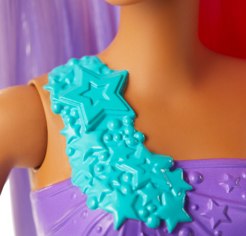 Barbie Dreamtopia Zeemeerminpoppen stralen in regenboogkleuren en inspireren kinderen om de mooiste verhalen te vertellen! Deze Barbie Zeemeerminpop maakt een duik in een kleurrijk topje en een glinsterende staart met sprankelende details. De felgekleurde haarversiering in haar lange, roze-paarse haar maakt haar look helemaal af. Je kunt de staart van Barbie in haar middel buigen, zodat je zelf kunt beslissen wat ze doet: zwemmen in zee of lekker in het zonnetje zitten. Je kunt dromen wat je wilt met deze Barbie zeemeerminpoppen, want als je op reis gaat naar Dreamtopia word je wakker in een wereld waar dromen uitkomen! Liefhebbers van sprookjes kunnen alle poppen en accessoires van Barbie Dreamtopia verzamelen om hun eigen sprookjeswereld te bouwen en hun dromen waar te maken. Per stuk verkrijgbaar en niet overal leverbaar. Poppen kunnen niet los staan. Afwijkende kleuren en versieringen mogelijk.