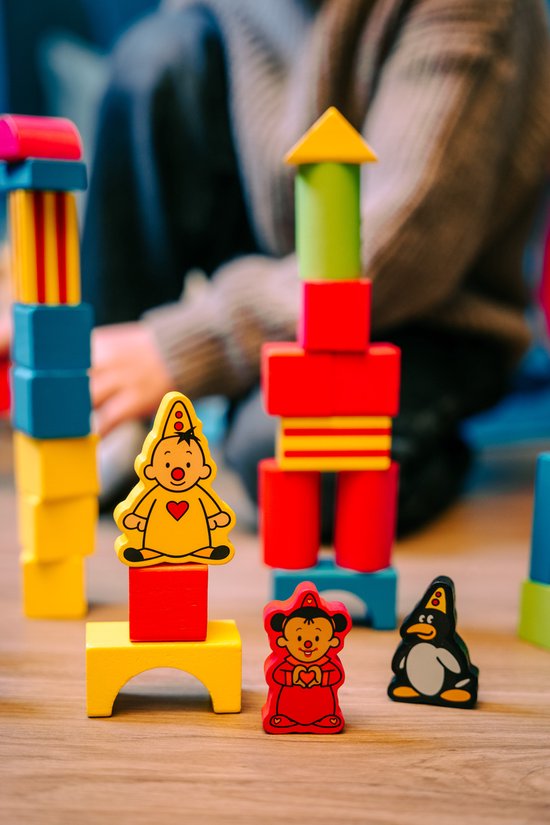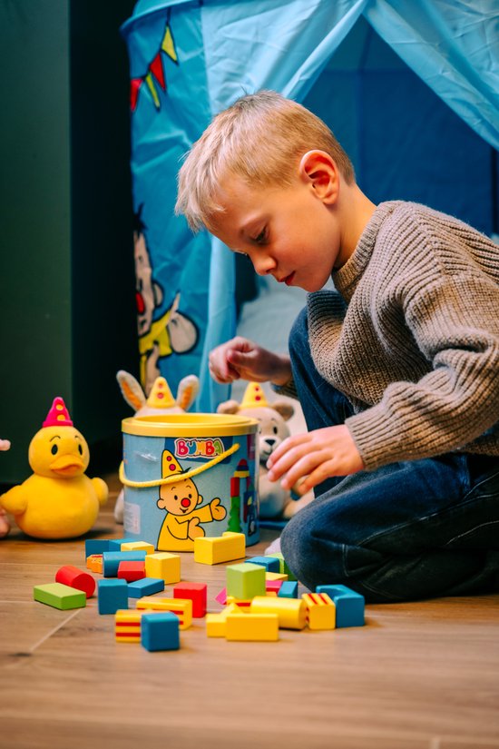 Met deze kleurrijke houten blokken van Bumba kan je kleine kapoen eindeloos bouwen. Ze zitten in een stevige ton met sorteerdeksel en handvat.