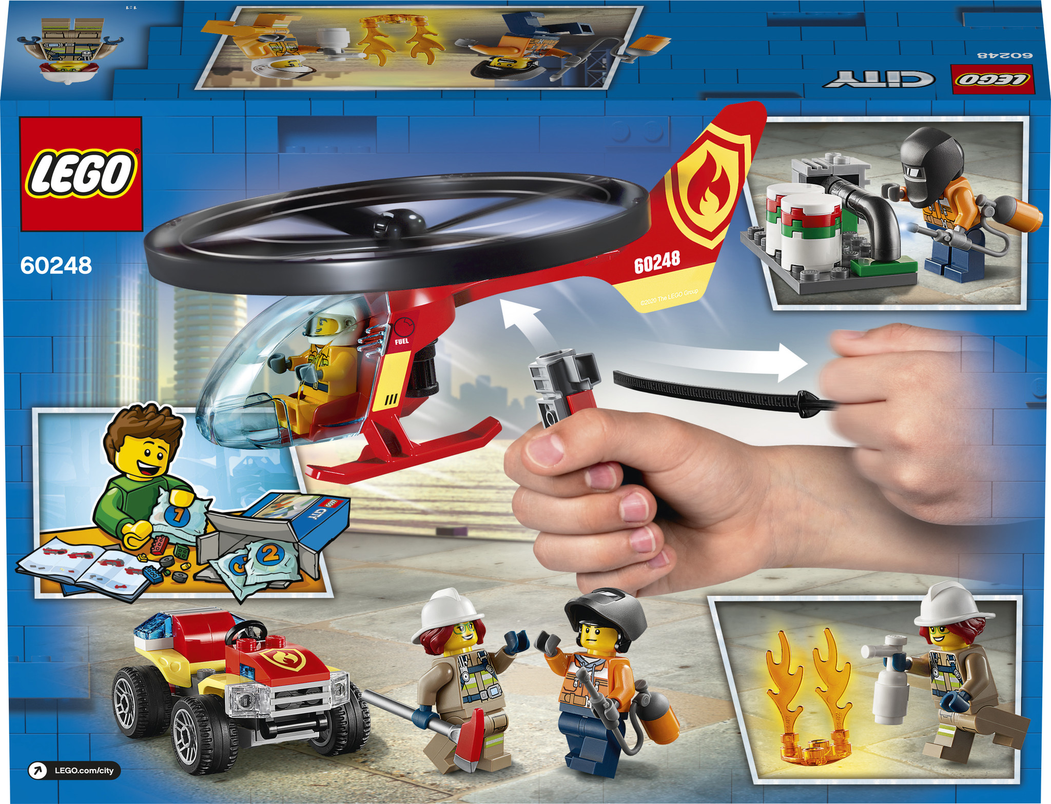 Aaaaahh! Vuur! Help! Een arbeider met een cool lasmasker heeft per ongeluk de inhoud van de pijp die hij aan het repareren was in brand gestoken! Gelukkig is de LEGO® City brandweerhelikopter in de buurt en de piloot heeft een noodoproep gedaan aan het