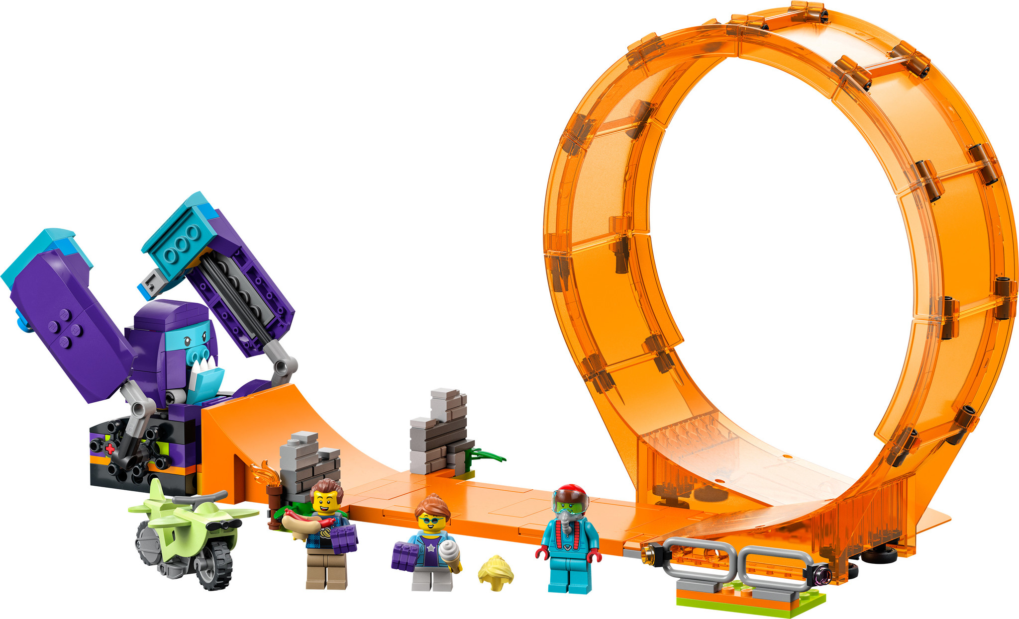 Jonge coureurs gaan met volle kracht vooruit op het uitdagende stuntparcours met chimpansee en doen mee met de LEGO City Stuntz racer Toppiloot met zijn coole gevleugelde motor. Vervolgens moeten ze proberen om over de mechanische chimpansee met zijn slop