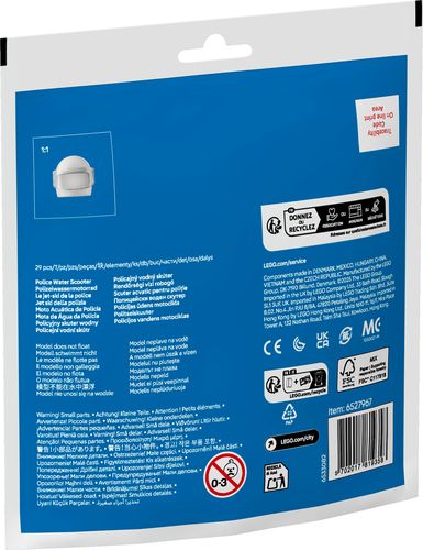 Er wachten kinderen spannende avonturen op de golven de LEGO® City Politiewaterscooter, inclusief een minifiguur van een politieagent met een reddingsvest, helm en handboeien.