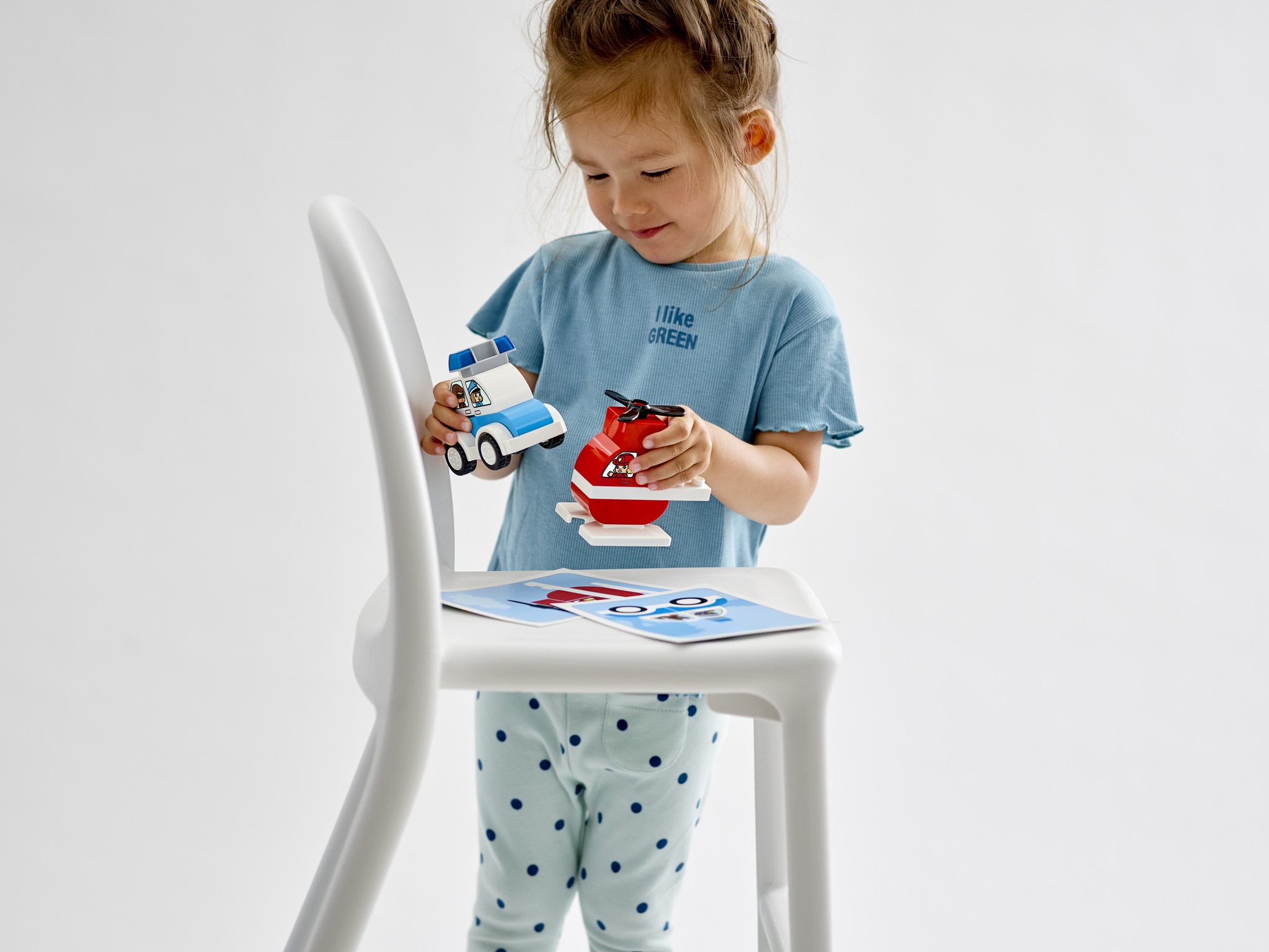 Peuters ontwikkelen spelenderwijs belangrijke vaardigheden met deze politiewagen die ze kunnen voortduwen en leuke brandweerhelikopter. Tijdens het bouwen verbeteren ze hun fijne motoriek en leren ze van alles over vormen en kleuren. Spannende reddingsmis