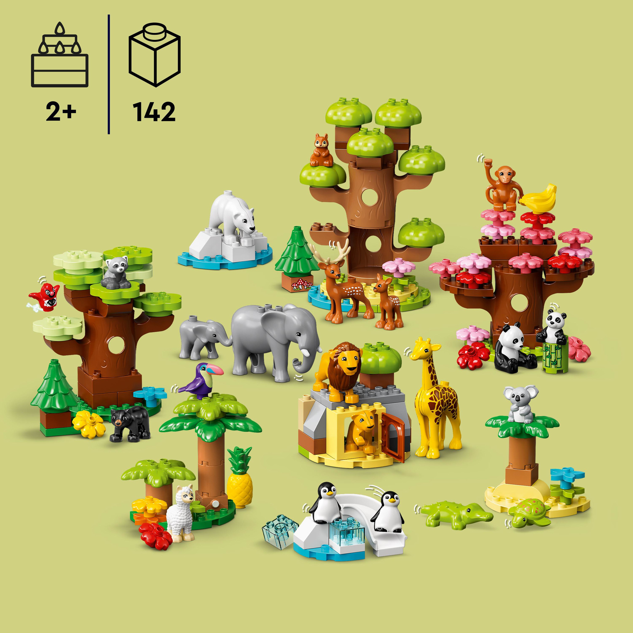 Neem jouw peuter mee op een wereldreis langs alle 7 continenten en de dieren die er leven, met de LEGO DUPLO Wilde dieren van de wereld (10975) set. Dit educatieve speelgoed voor kinderen van 2 tot 5 jaar bestaat uit 22 verschillende dieren in hun natuurl