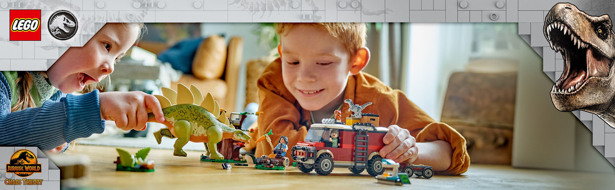 Na het bouwen van de LEGO® Jurassic World speelset kunnen kinderen eindeloze verhalen bedenken met behulp van de Stegosaurus figuur met beweegbare poten, een kleine Velociraptor en de minifiguren van Ben en Sammy. Er is ook een boom met een uitkijkpost