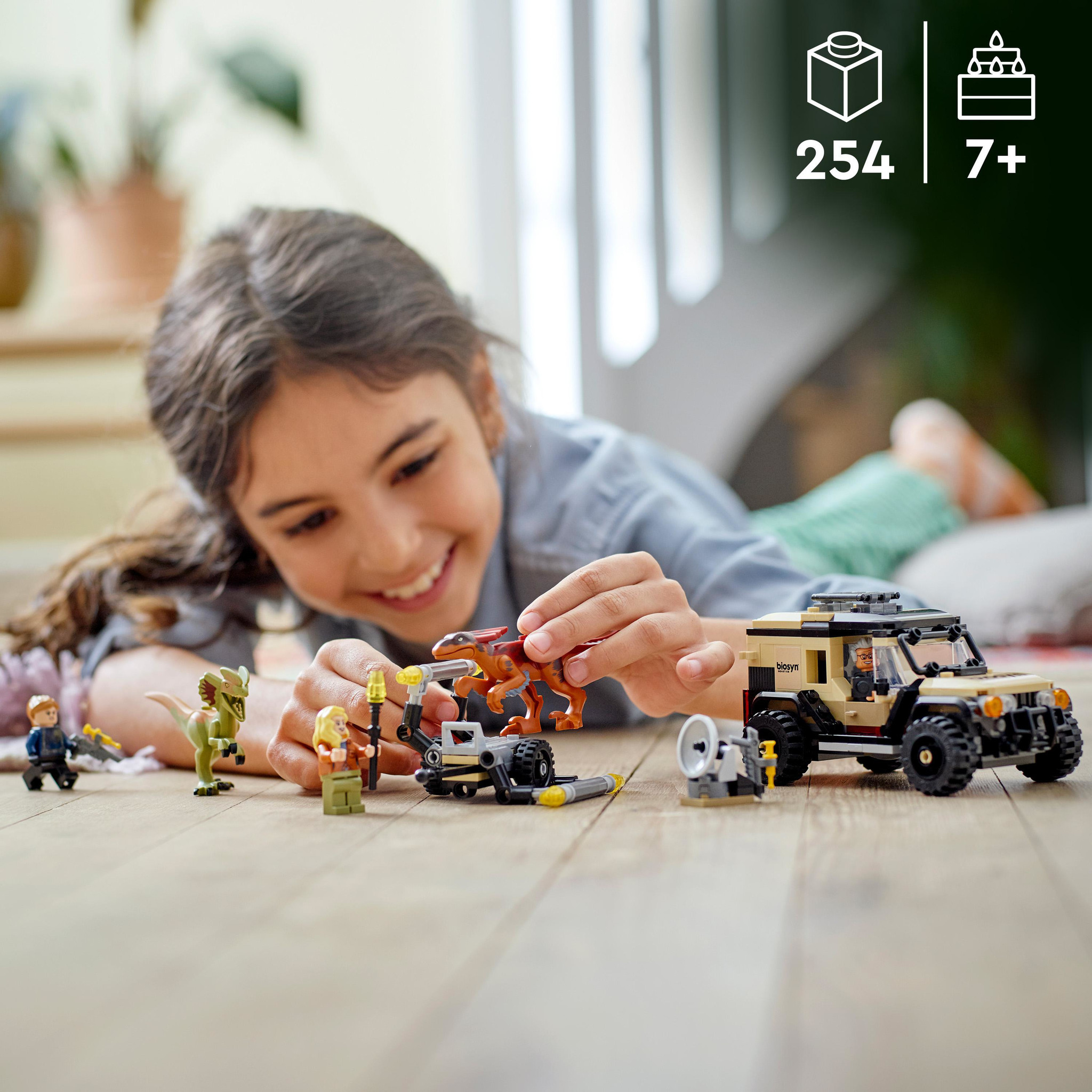 Met dit indrukwekkende LEGO Jurassic World Pyroraptor & Dilophosaurus transport (76951) constructie speelgoed kunnen kinderen vanaf 7 jaar spannende avonturen uit de film Jurassic World: Dominion beleven door de dino’s te tracken vanuit een off-road terre
