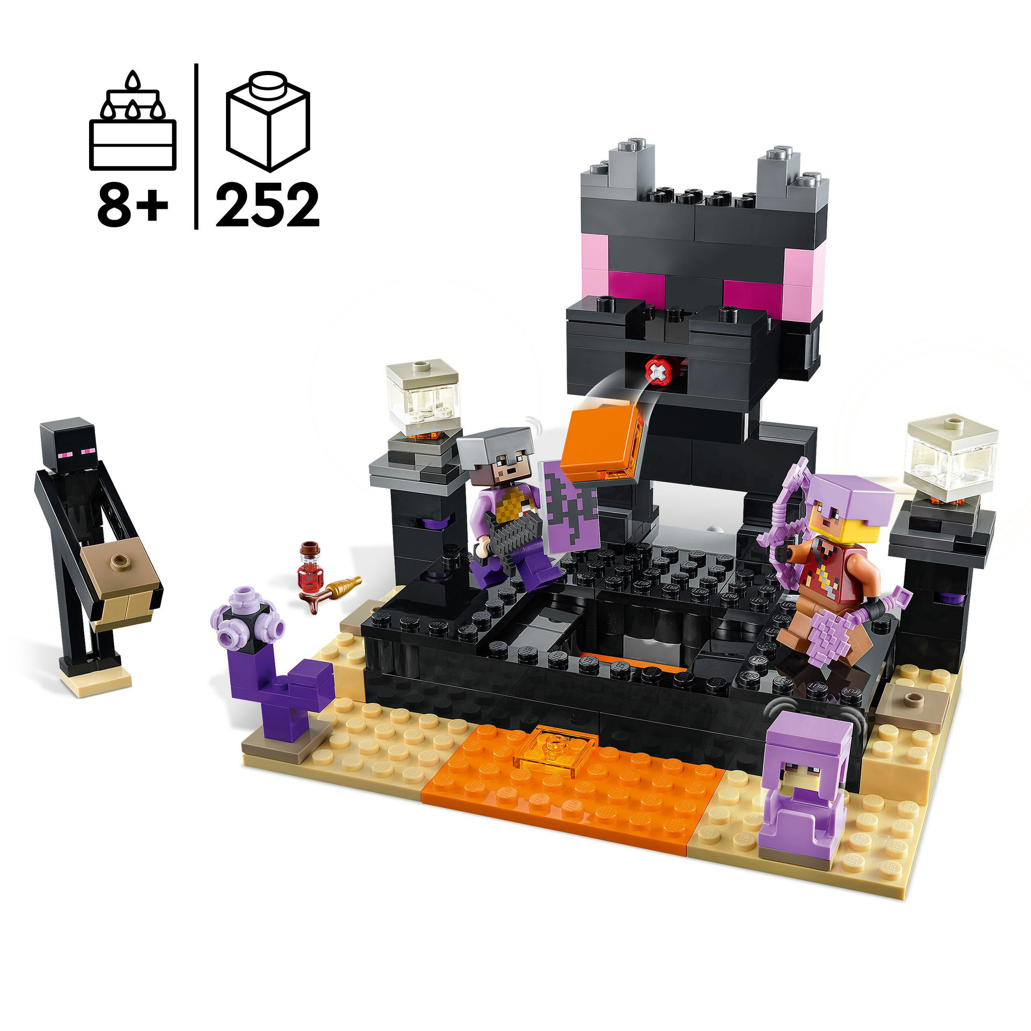 Minecraft confrontaties zijn nog nooit zo spannend geweest als in LEGO Minecraft De Eindarena (21242). Kinderen vanaf 8 jaar zullen al hun Minecraft vaardigheden nodig hebben om de actie in deze leuke set met constructie speelgoed te overleven.Een End str