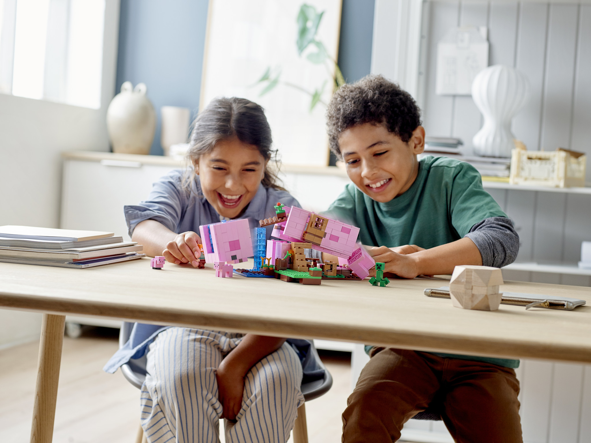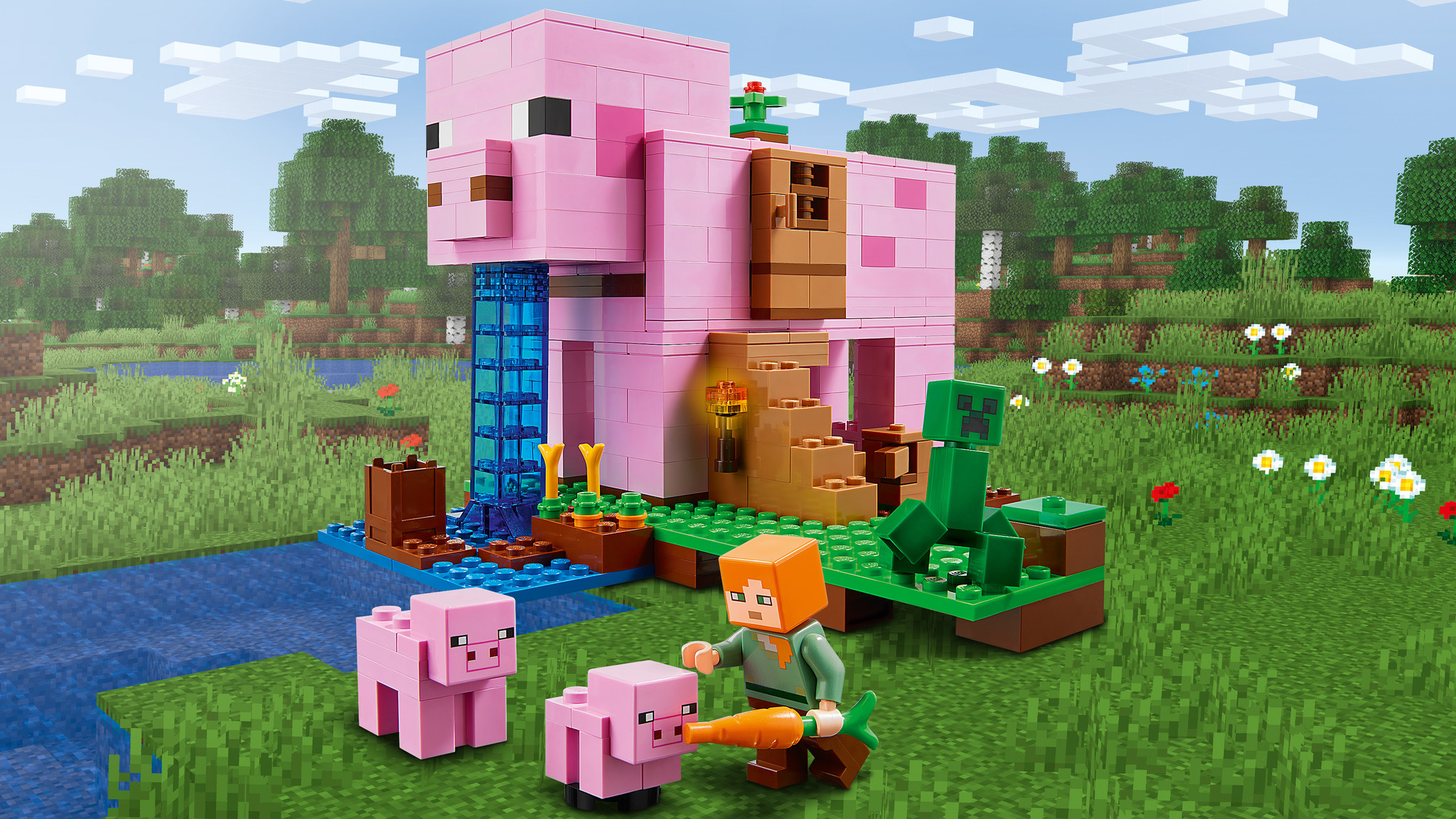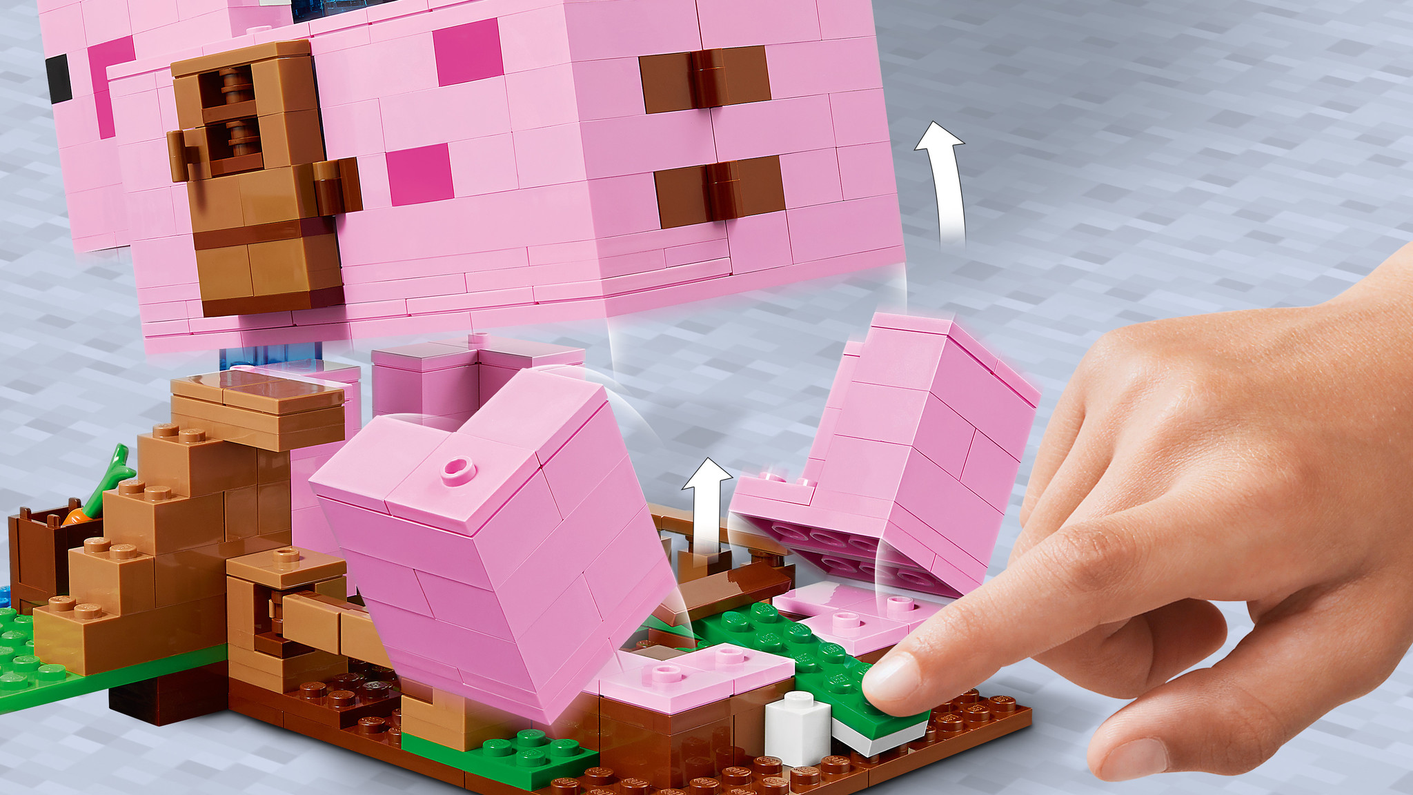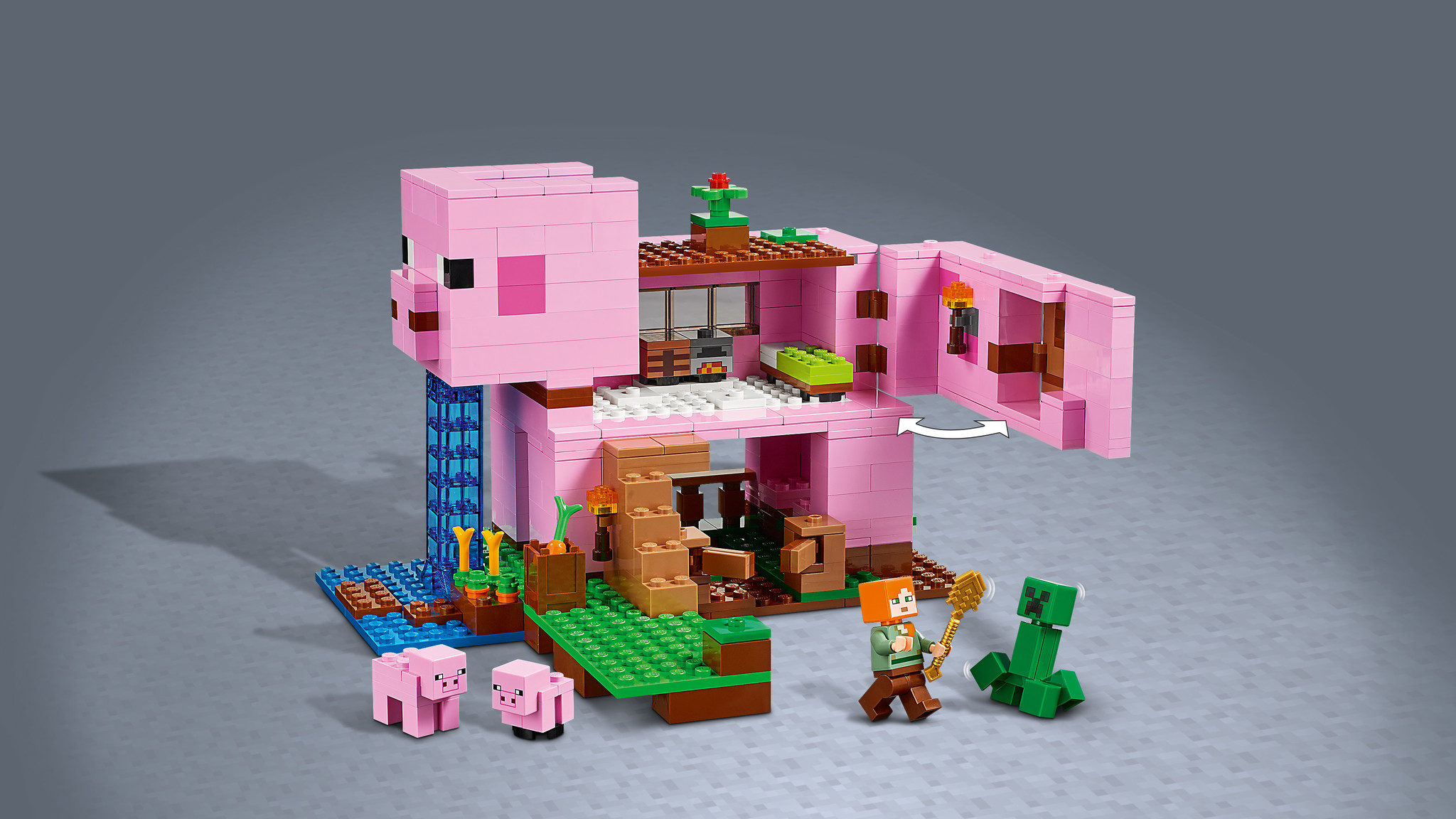 Gebruik je Minecraft™ vaardigheden om een huis te bouwen in de vorm van een reusachtig varken! De zijkant van het bouwwerk kan open, daarachter vind je een grote kamer. Til het dak eraf en ontdek een kleinere kamer in de kop van het varken. Verken same