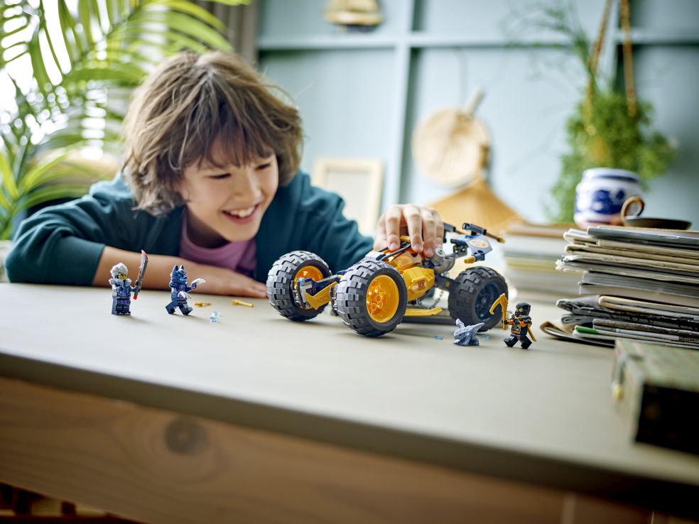Jongens en meisjes vanaf 7 jaar kunnen spannende scènes uit seizoen 2 van de tv-serie NINJAGO® Dragons Rising naspelen met LEGO® NINJAGO Arins ninjaterreinbuggy (71811). Deze avonturenset voor kinderen bevat een geel speelgoedvoertuig met bewegende wi