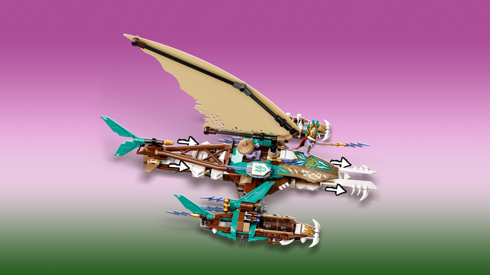 Sta aan het roer van de geweldige catamaran van de ninja’s en leid ze richting een fantastische zeeslag tegen de Beschermers! Zet de aanval in en vuur het geschut met veermechanisme af. Waahh! De machtige catamaran van de Beschermers die zich in 3 afzo