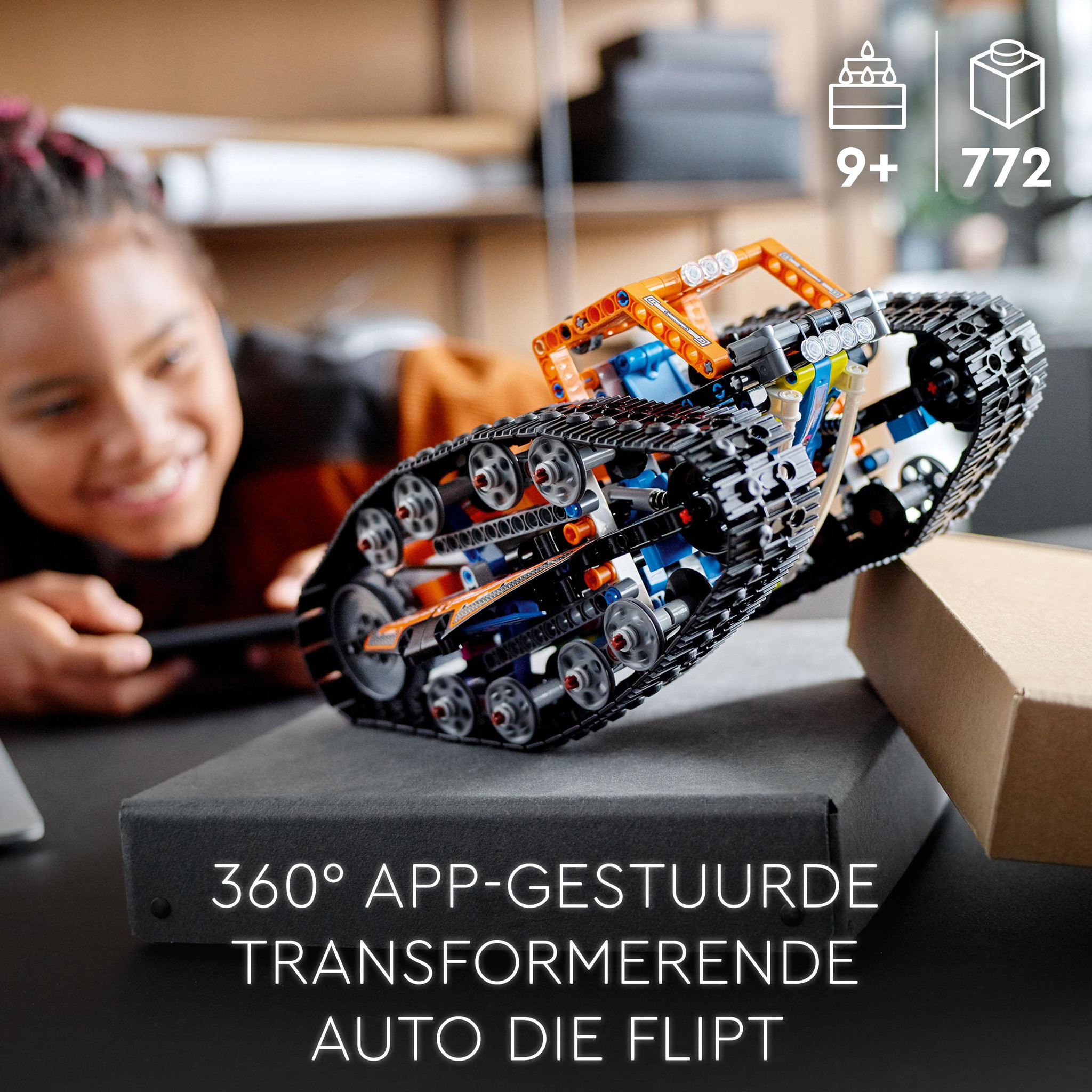 Kinderen op leeftijd genieten van twee keer zoveel plezier met dit LEGO Technic Transformatievoertuig met app-besturing (42140), een 2 in 1 op afstand bestuurbare flipauto. In een primeur voor LEGO Technic sets, klapt deze transformerende afstandsbedie