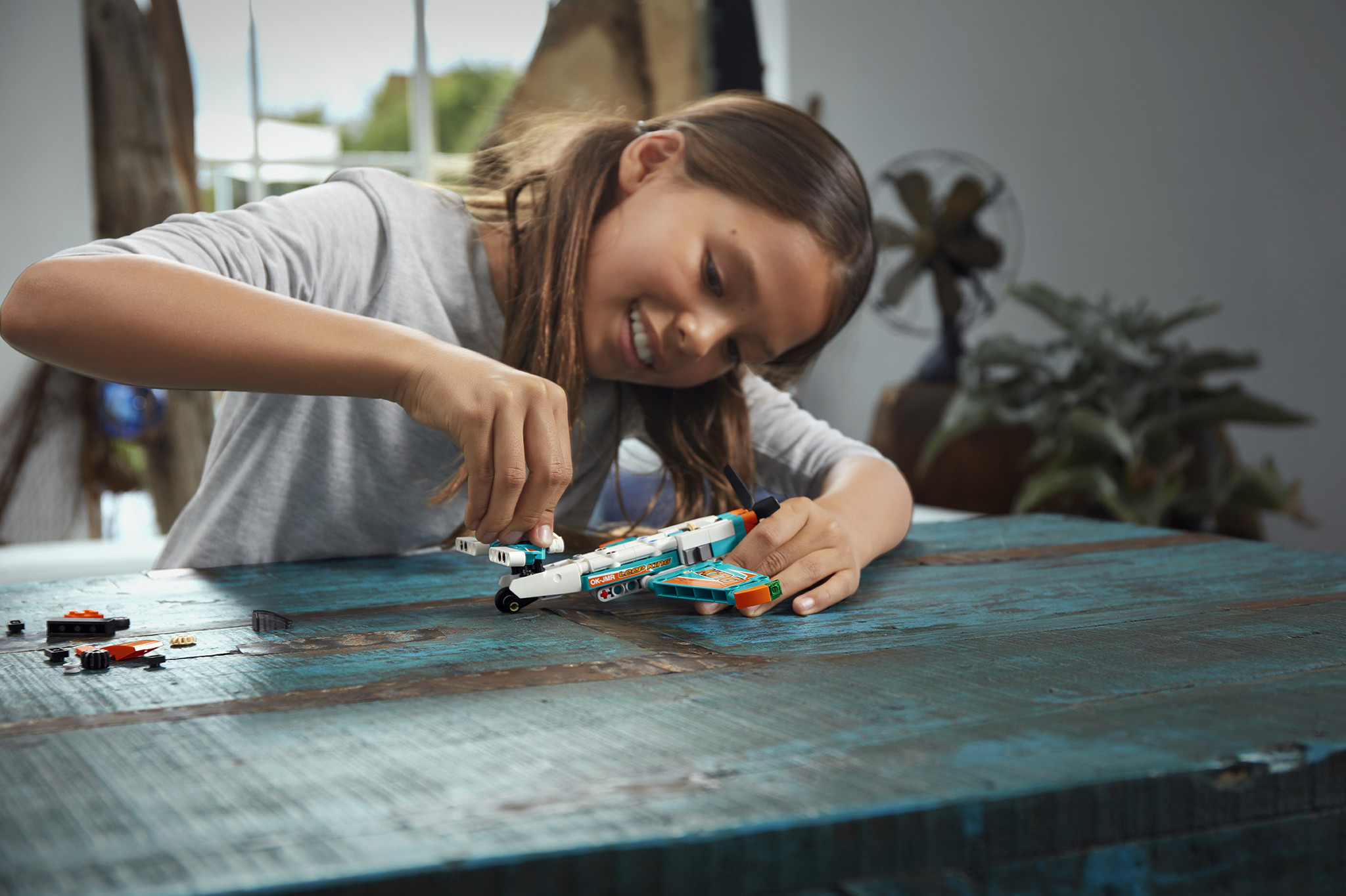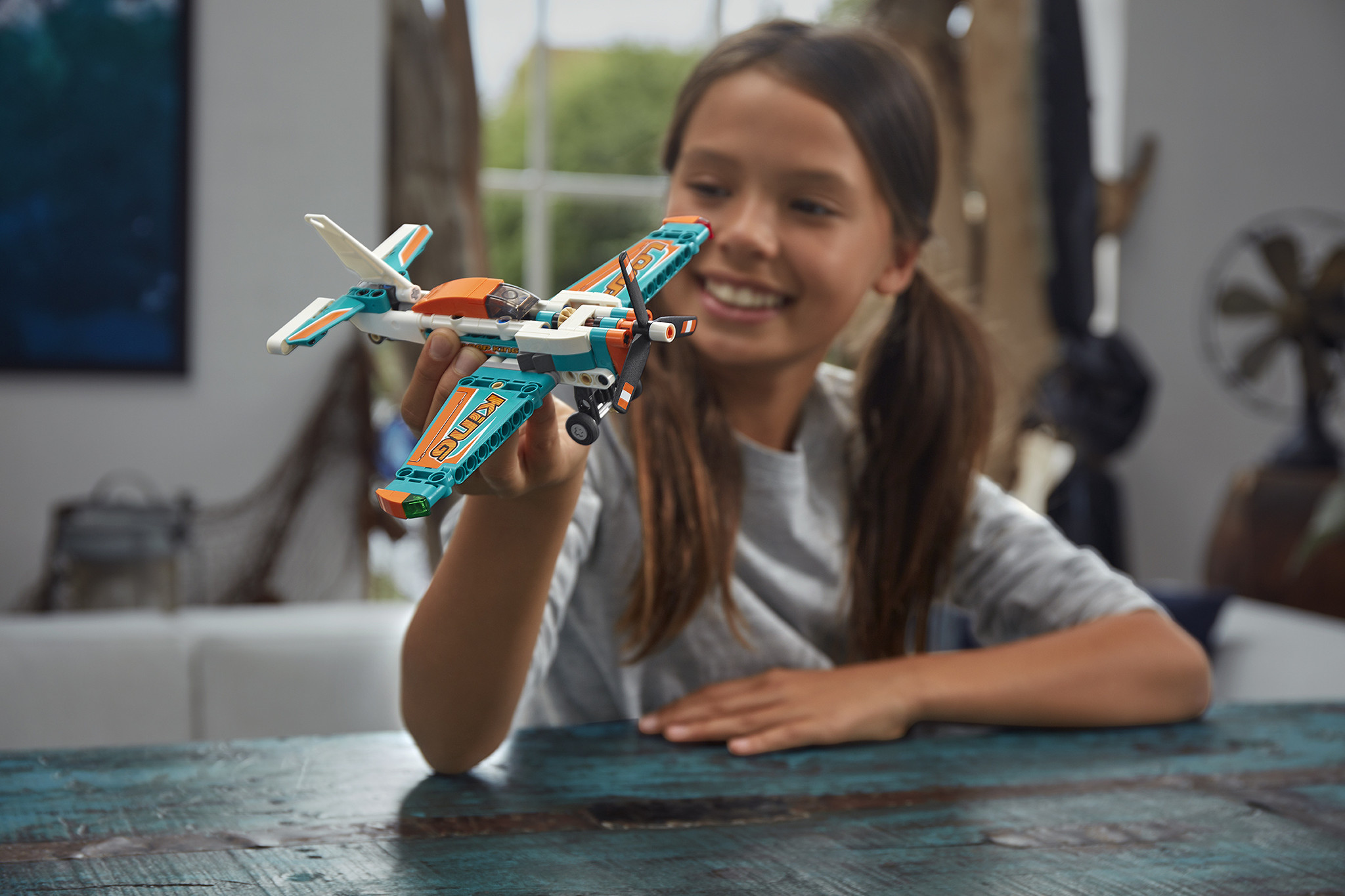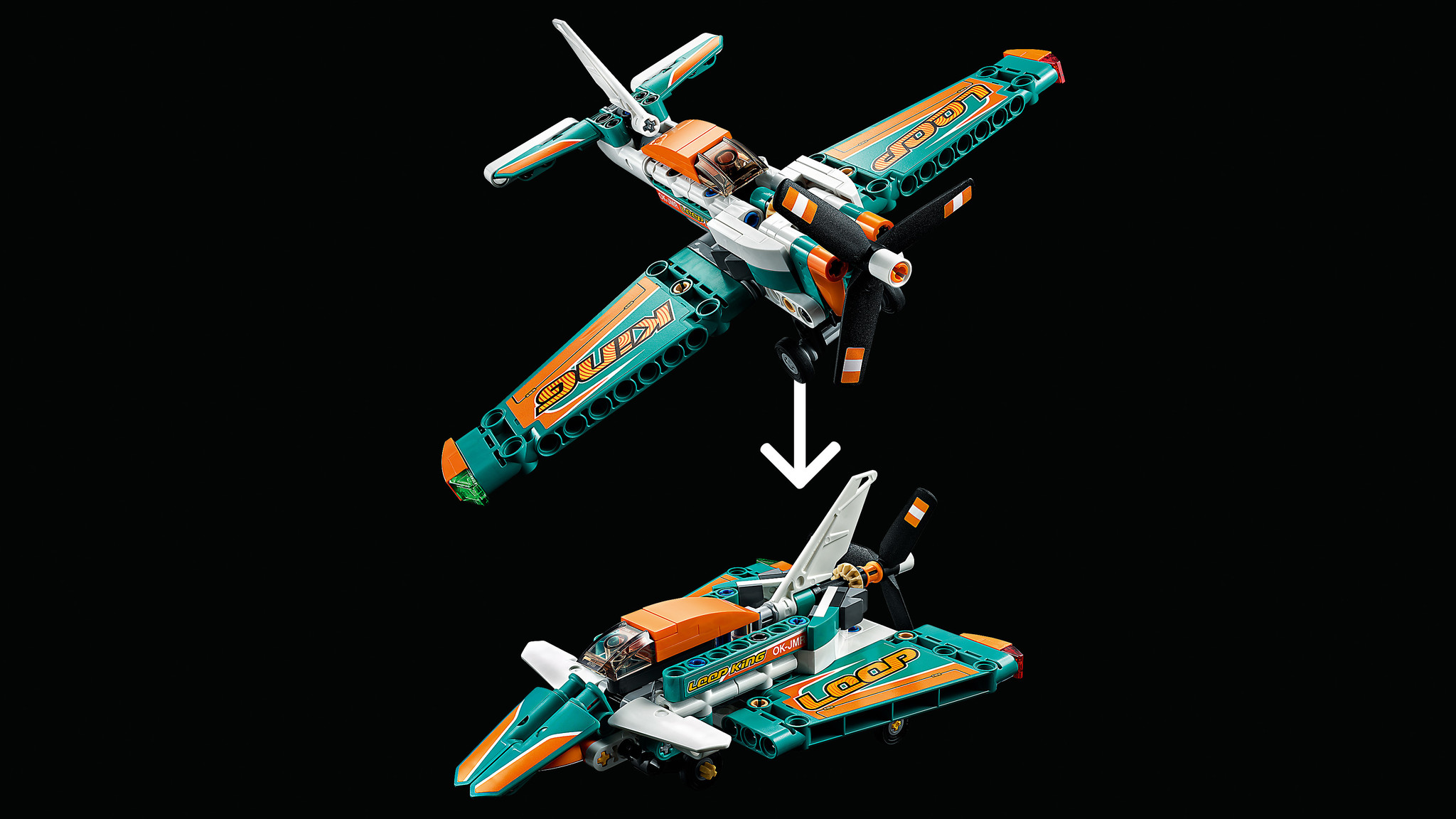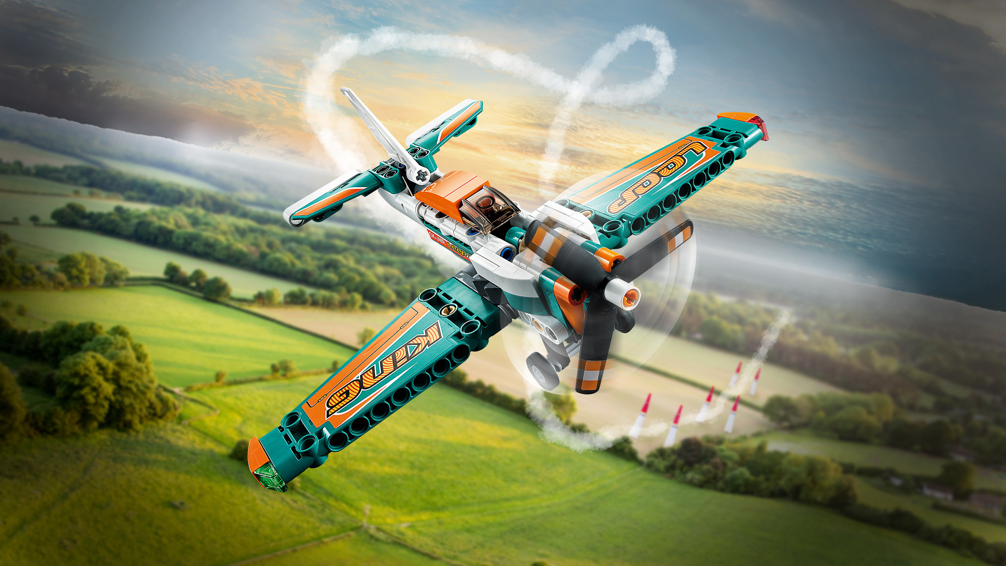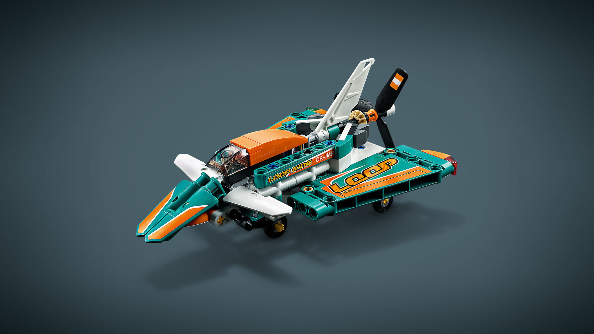 Scheer door de lucht in dit geweldige LEGO® Technic Racevliegtuig. Bewonder de opvallende kleuren en de sponsorstickers, net als op een echt racevliegtuig. Rijd rond op de grond terwijl je je voorbereidt om op te stijgen en kijk hoe de propeller ronddraai