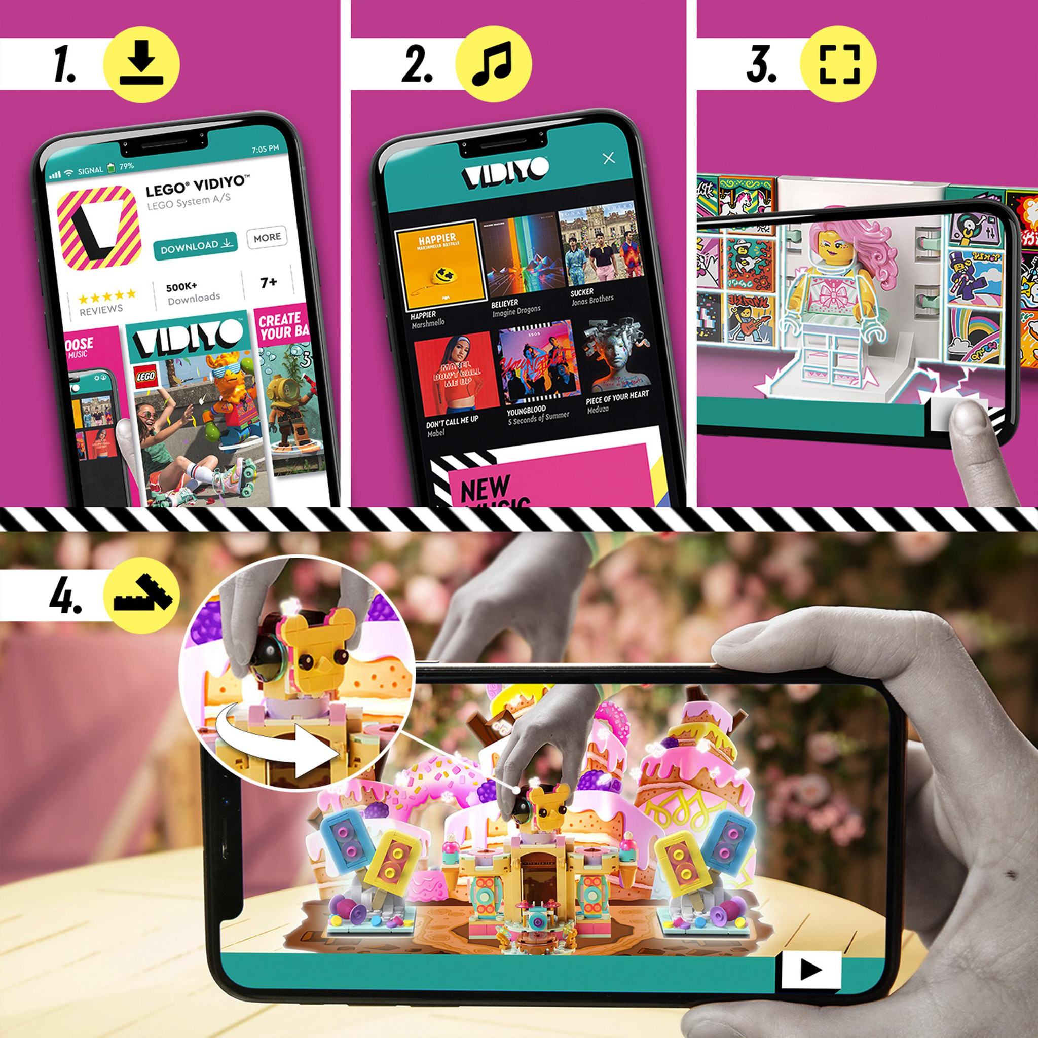 Open de wereld van het maken van muziekvideo’s voor kinderen als ze regisseren, produceren en de ster zijn in hun eigen popmuziekvideo’s met de LEGO VIDIYO Candy Castle Stage BeatBox (43111) muziekvideo maker set. Download de gratis augmented reality app