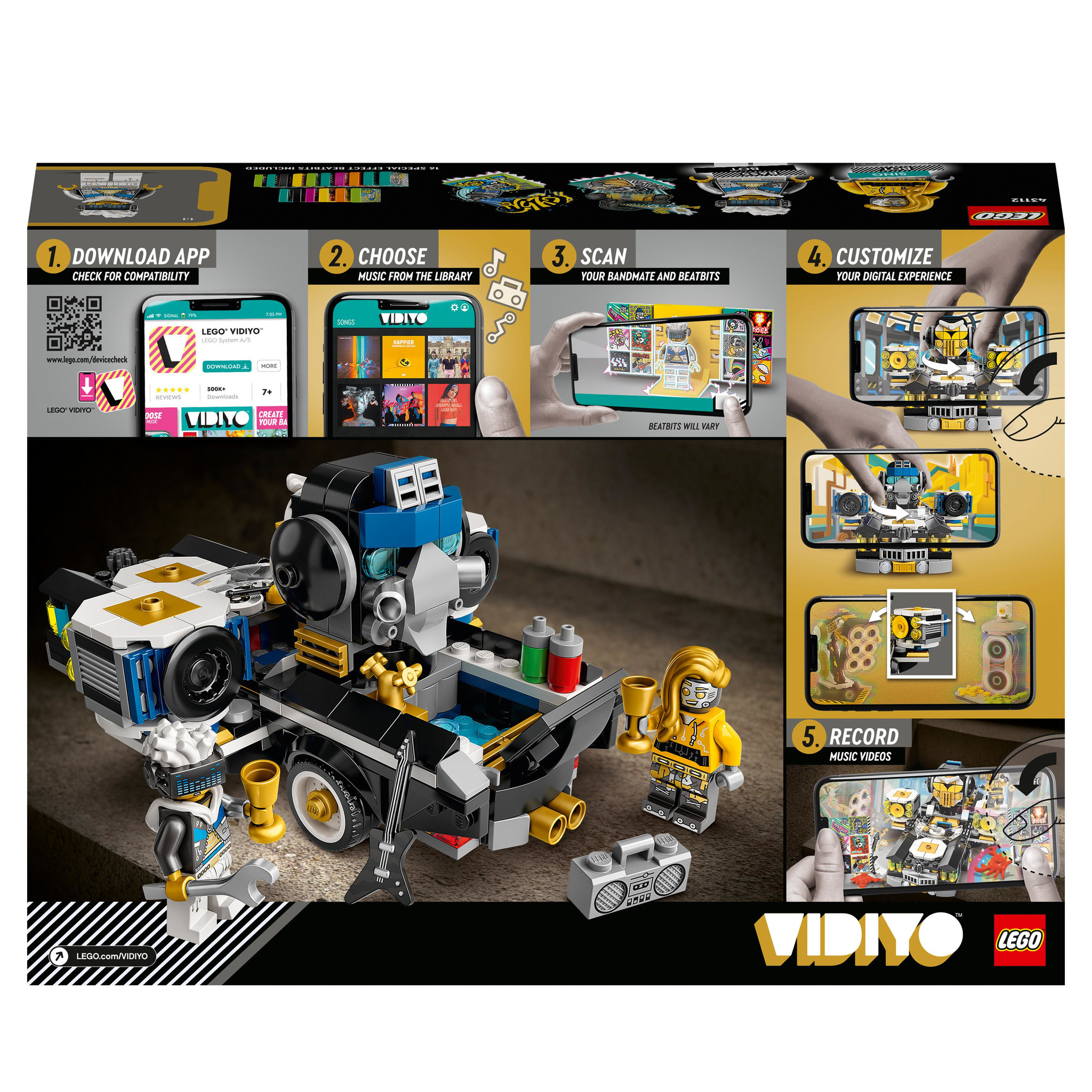 Open de wereld van muziekvideo’s maken voor kinderen als ze regisseren, produceren en de ster zijn in hun eigen muziekvideo’s met de LEGO VIDIYO Robo HipHop Car BeatBox (43112) set. Download de gratis augmented reality app om de minifiguren te scannen en