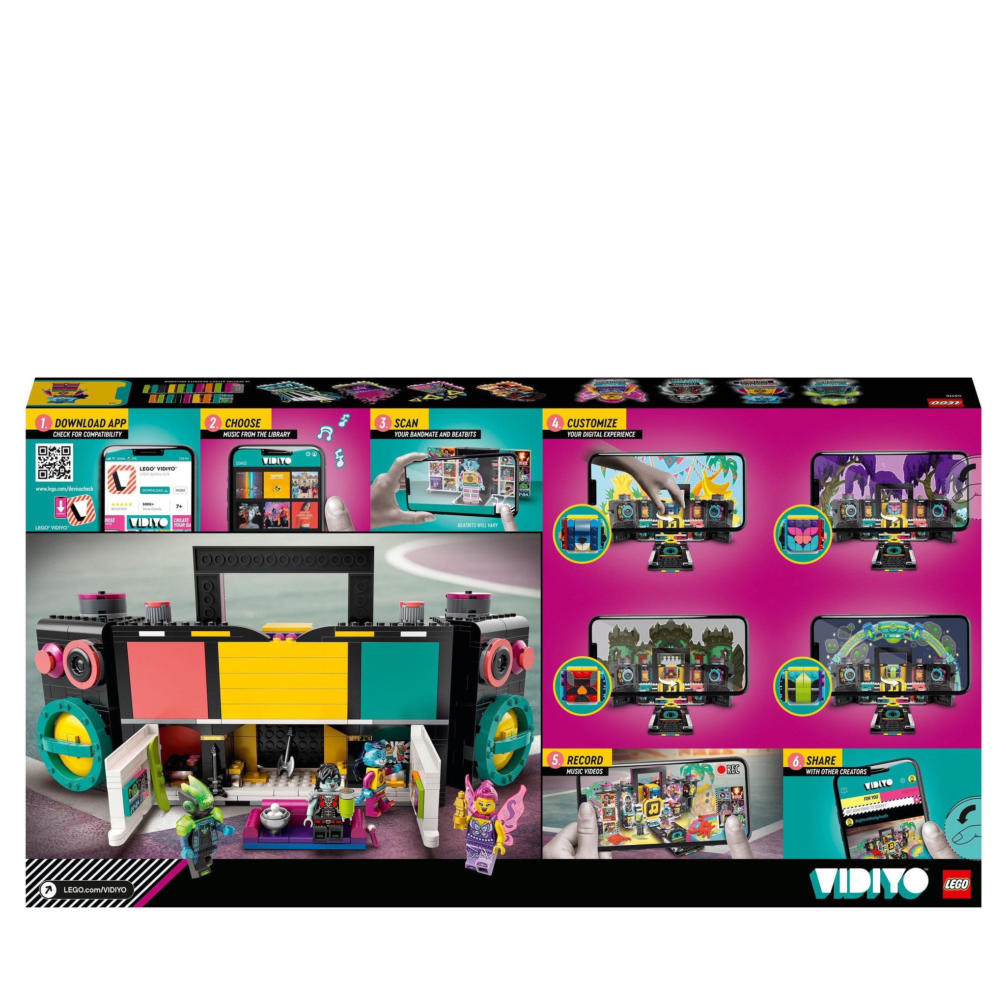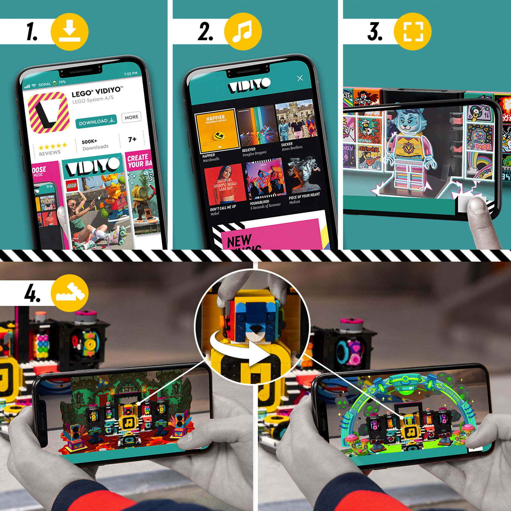 Open de wereld van het maken van muziekvideo’s voor kinderen als ze regisseren en de hoofdrol spelen in hun eigen muziekvideo’s met de LEGO VIDIYO The Boombox BeatBox (43115) set. Download de gratis augmented reality app om de 4 muziekminifiguren te sc