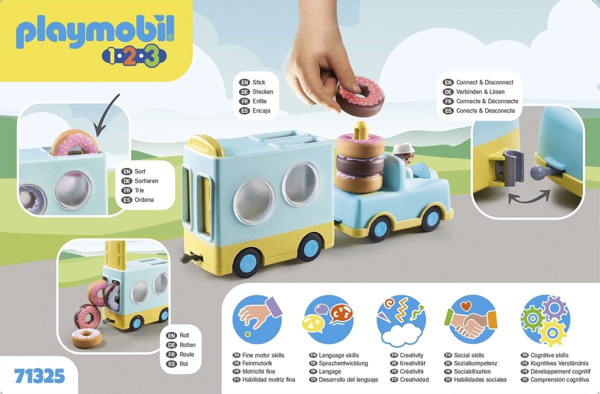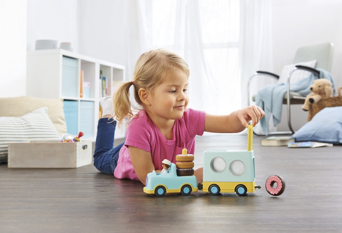 De donuttruck moedigt kleine kinderen aan om actiever te zijn: de prachtig versierde donuts worden in de aanhanger gesorteerd. Als de achterkant wordt geopend, tuimelen de kleine donuts uit de aanhanger en rollen ze door de kamer. Achtervolgen is leuk, ze