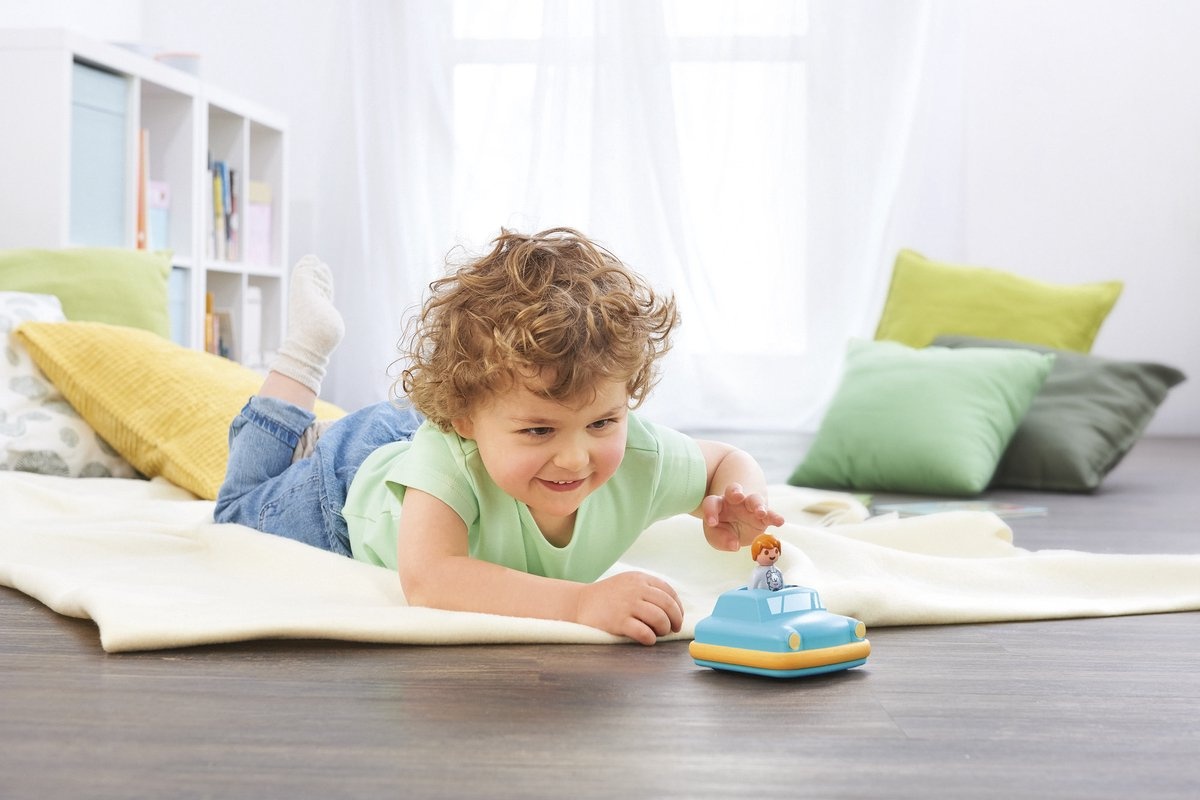 De speelgoedauto met speciale vliegwielmotor biedt plezier en opwinding: met een duwtje rijdt de auto zichzelf (zowel vooruit als achteruit), waardoor peuters worden aangemoedigd om actief te zijn en tegelijkertijd hun fijne motoriek en causaal denken te