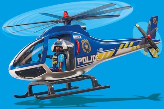 Deze politieoperatie is heel belangrijk. De boef wil met een parachute vluchten. Maar hij had geen rekening gehouden met de slimme PLAYMOBIL-politieman in zijn helikopter. Terwijl de dief langzaam naar de grond glijdt, houdt de agent hem in de gaten vanuit de cockpit van de helikopter. Hij wordt al opgewacht bij de landing. Het volgende uitje is naar de gevangenis.