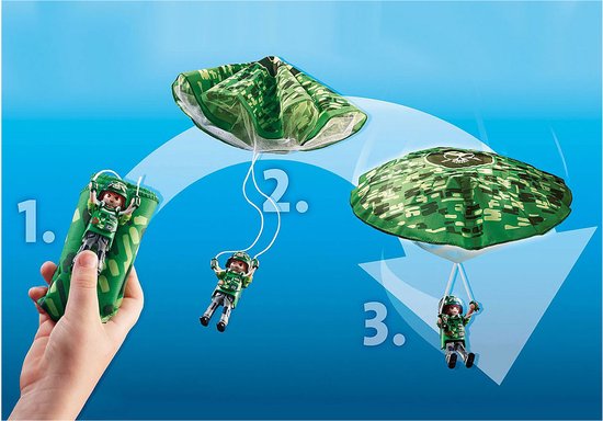 De parachute kan met een figuur de lucht in worden gegooid en vervolgens naar de grond zweven.