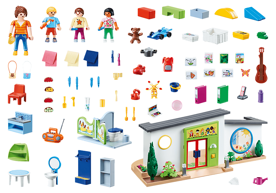Uitgerust met kindertafel, stoelen, speelhoek, keuken en verzorgingsruimte. De werkende deurbel en buitenverlichting, het plantenbed buiten en vele andere leuke accessoires verzekeren uren speelplezier! Kan gecombineerd worden met art. 70282 Peutergroe