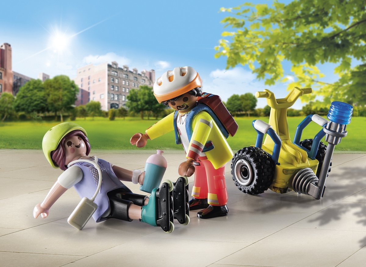 Schiet snel te hulp met de Segway starterpack van PLAYMOBIL. Een inline skater is gevallen in het park en kan niet meer opstaan. De behulpza