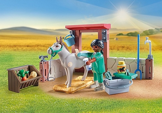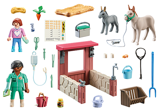 Help de dierenarts bij de zorg voor de ezels met de PLAYMOBIL Starter Pack Dierenarts missie met de ezels. De dokter onderzoekt voorzichtig het ezelveulen onder het toeziende oog van de moeder. Gelukkig kan het zieke dier snel geholpen worden. Daarna i