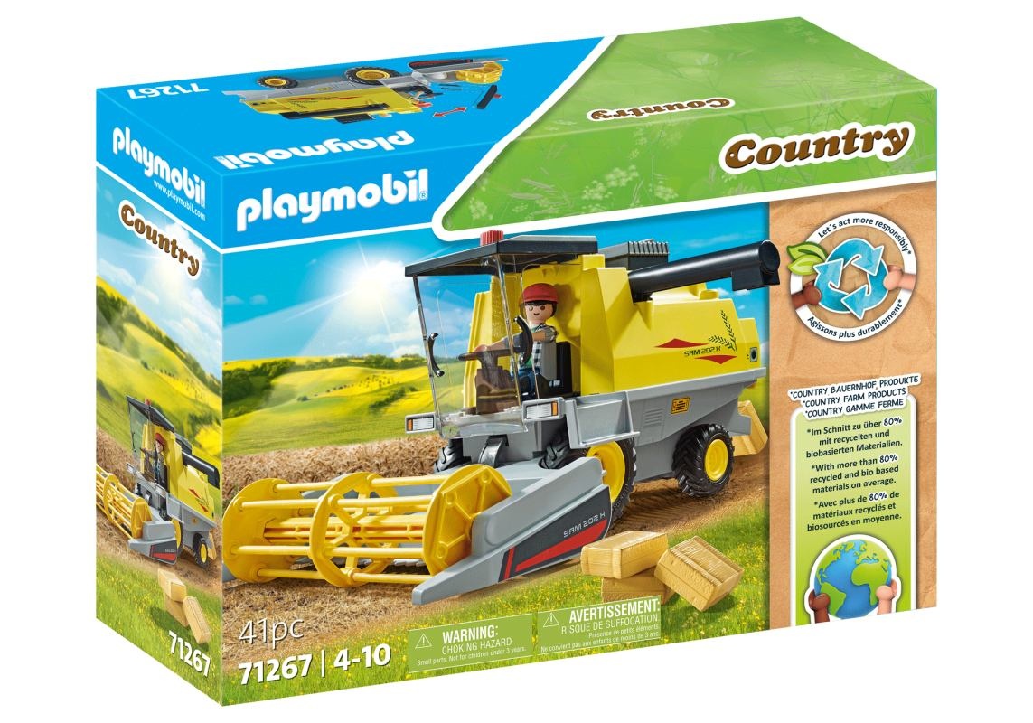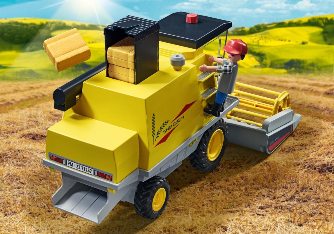 Het gele landbouwvoertuig heeft beweegbare delen en een cabine die open kan, zodat de figuur achter het stuur kan zitten.