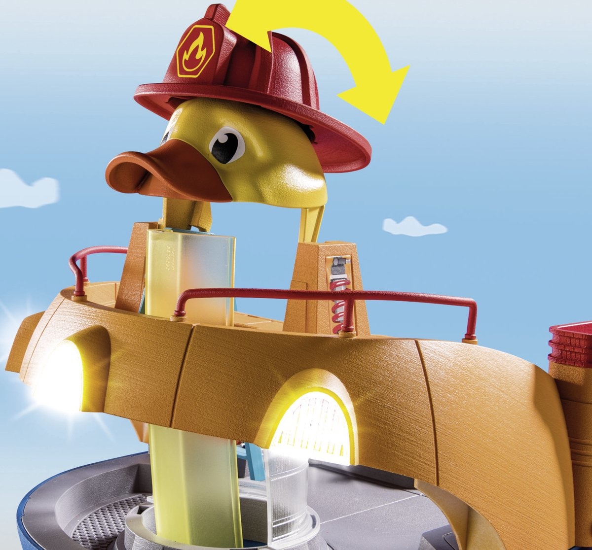 Het hoofdkwartier van DUCK ON CALL is het operatiecentrum voor Ducklas, Freddy Fire, Polly Police en Mikey Medic. Als er een noodgeval is in Playmoville, zijn de vier helden meteen ter plaatse! Zodra het alarm afgaat, springt Freddy snel op de vrijeval