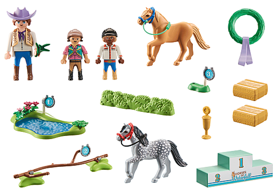 Start de competitie met je pony in het PLAYMOBIL Ponysporttoernooi. Op het toernooiterrein met verschillende obstakels zoals een watertrench, tak en s