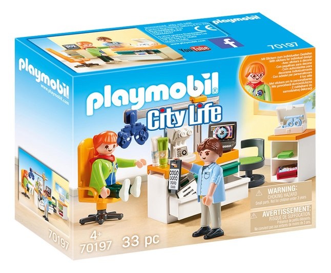 De oogarts doet vandaag een oogtest. Eerst moet de patiënt de symbolen op het bord lezen. Vervolgens wordt hun zicht verder onderzocht met speciale apparatuur. Dokter en patiënt zitten tegenover elkaar en de vrouw kijkt recht vooruit door de refractor. He