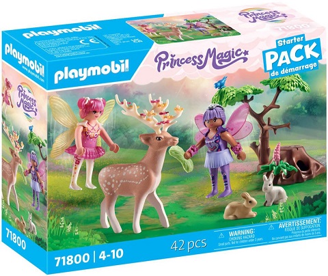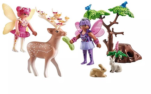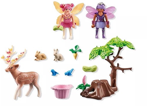 Twee vriendelijke bosfeeën zorgen liefdevol voor de dieren in het bos. Een van de feeën versiert het majestueuze hert met kleurrijke bloesems terwijl het zachtjes gevoerd wordt. Twee nieuwsgierige konijnen en twee levendige vogels verrijken de magische set en zorgen voor veel plezier.