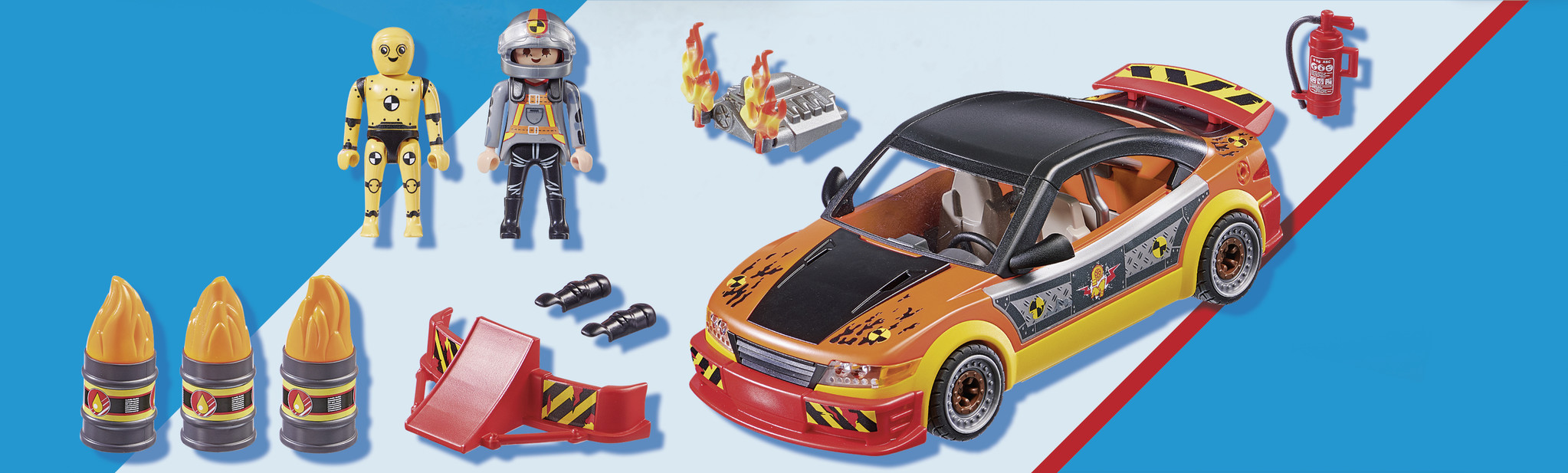 Kan gebruikt worden als race- of stuntauto door verschillende onderdelen, zoals de bumper, schans en het brandend motorblok te vervangen. Incl. bestuurder en crashtest dummy. Afmetingen: 23,5 – 26x12x7,5 cm (lxdxh).