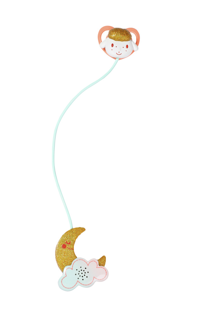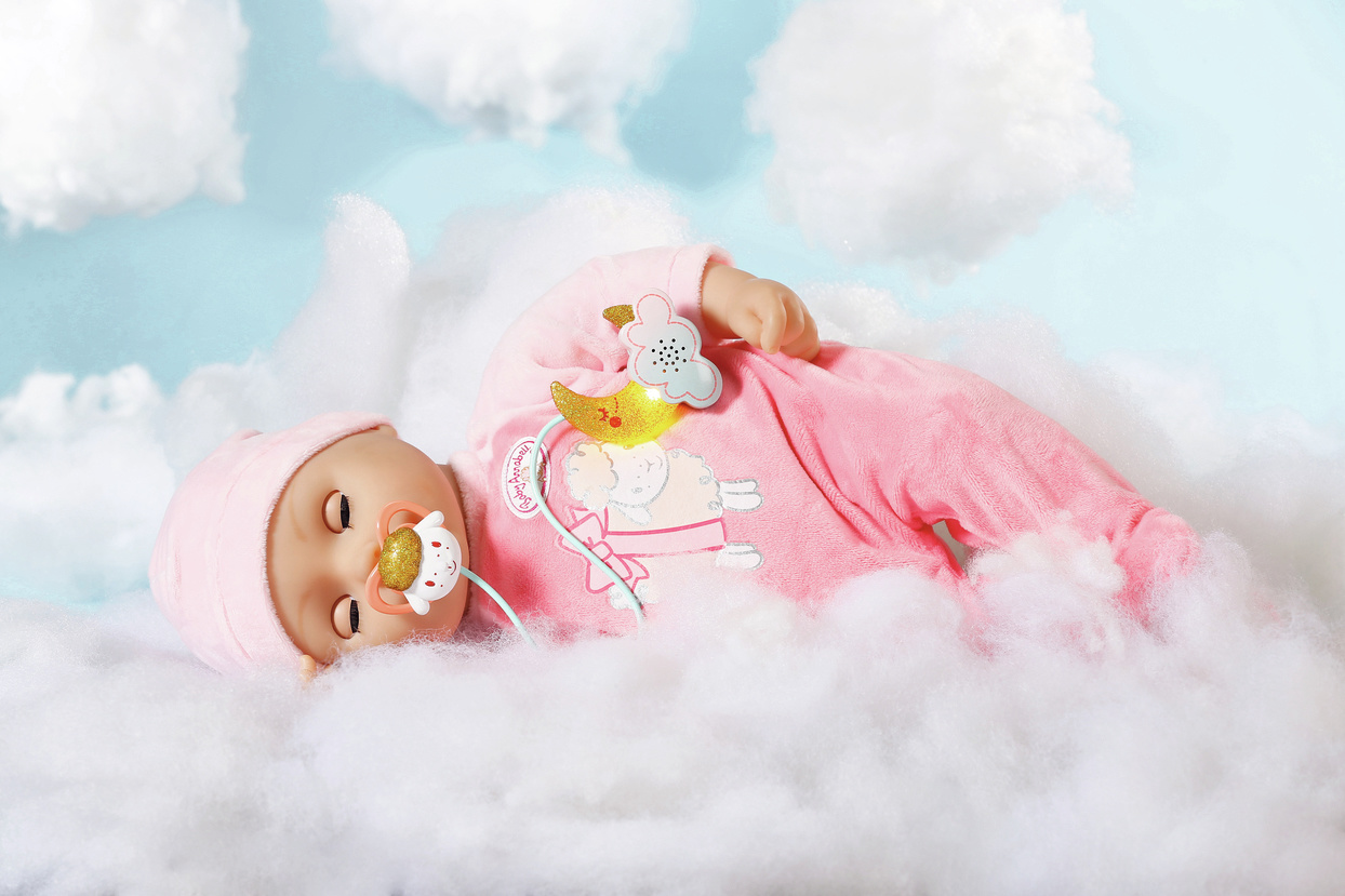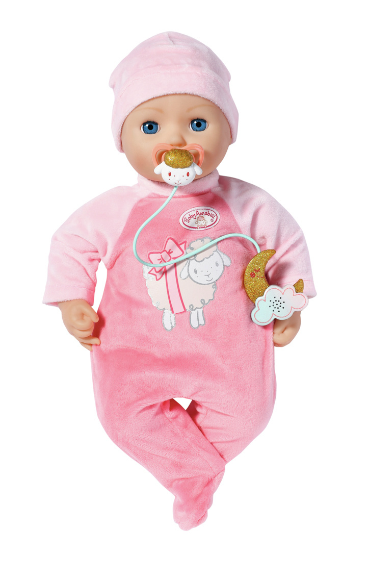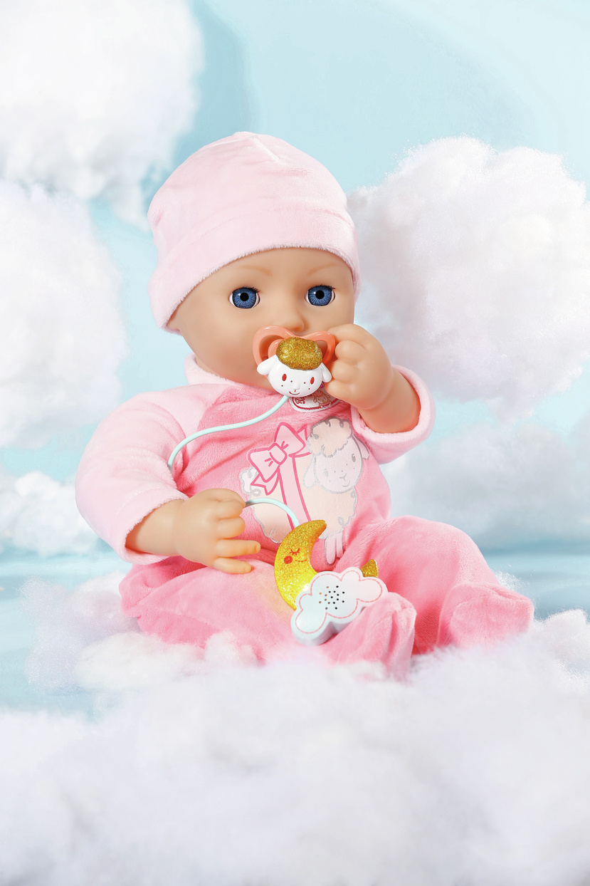 Het schaap en de maan helpen Baby Annabell in slaap te vallen en fijn te dromen. Zodra ze haar speentje in haar mond heeft, speelt het een slaapliedje af en zingt het schaapje zijn ‘mèèh’-lied. De schattige maan verlicht de weg naar dromenland. Je kunt het speentje vastmaken aan het speelpakje met behulp van de wolkenclip, zodat hij niet uit bed kan vallen. – Originele accessoires voor de Baby Annabell-pop. – De accessoires van topkwaliteit stimuleren de verbeelding en bieden nieuwe mogelijkheden en ideeën om te spelen. – Vereist batterijen (niet inbegrepen). Baby Annabell Sweet Dreams Speentje (43 cm) met licht- en geluidseffecten. Met nachtlampje in de vorm van een maan en slaapliedje. Lekker slapen met nachtlampje in de vorm van een maan en slaapliedje.