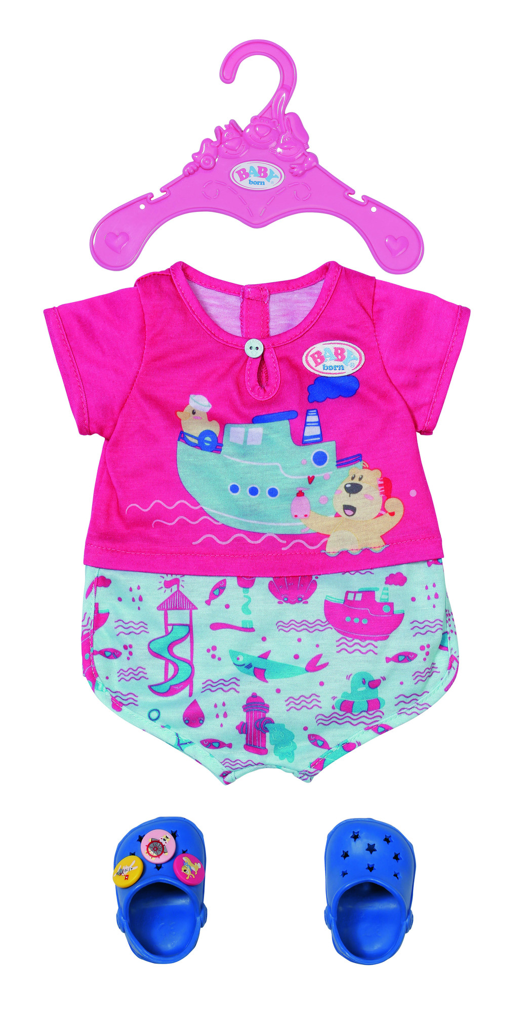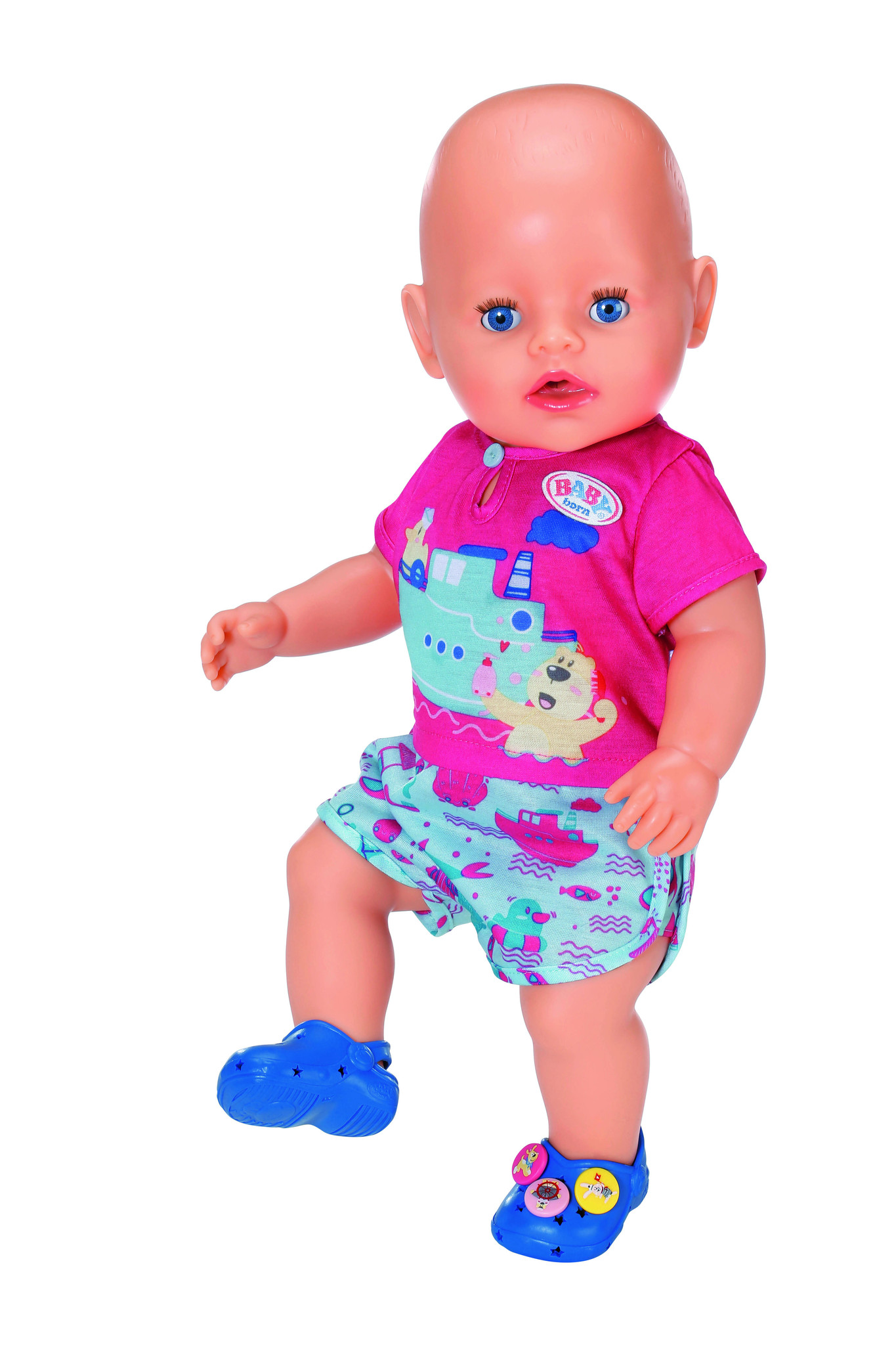 Berta de stoombootkapitein zet koers richting de badkamer terwijl Bruno de beer een bad neemt in de branding… misschien zouden deze prints op de pyjama het begin kunnen zijn van een verhaal. Op het broekje van de onesie staan nog meer prints met waterparkthema. BABY born draagt blauwe klompen met speldjes, zodat haar voetjes het niet koud krijgen op de tegelvloer. – Kleding van topkwaliteit voor de BABY born-pop. – Voor verbeterd, gevarieerd en langdurig speelplezier. – Makkelijk aan en uit te trekken. BABY born Bad Pyjama met schoenen (43 cm) met onesie en schoenen. Inclusief kledinghanger. Korte pyjama inclusief schoenen. Korte onesie voor de nacht inclusief schoenen.