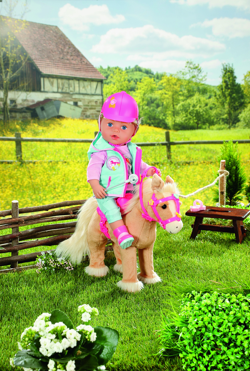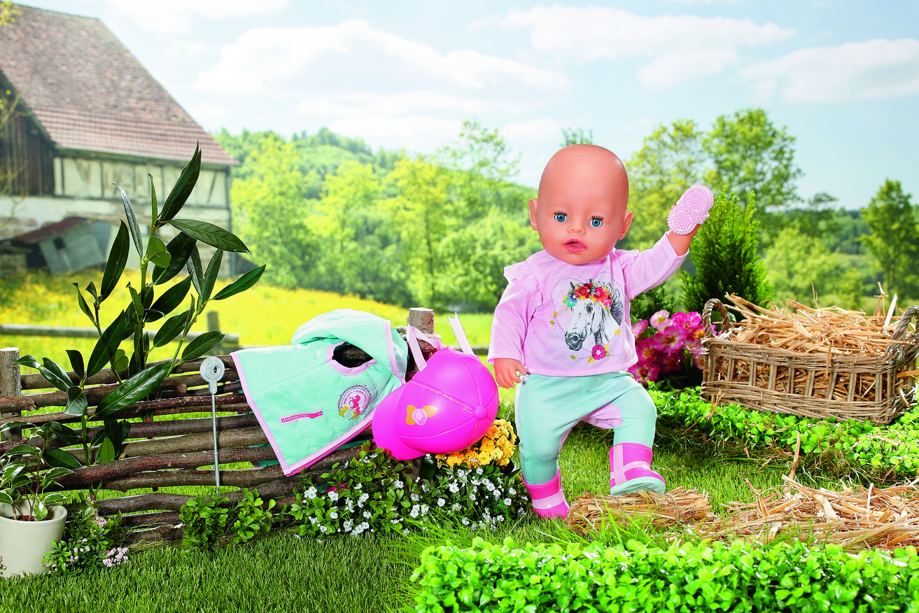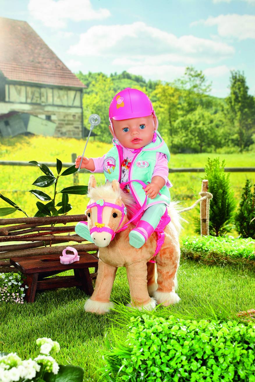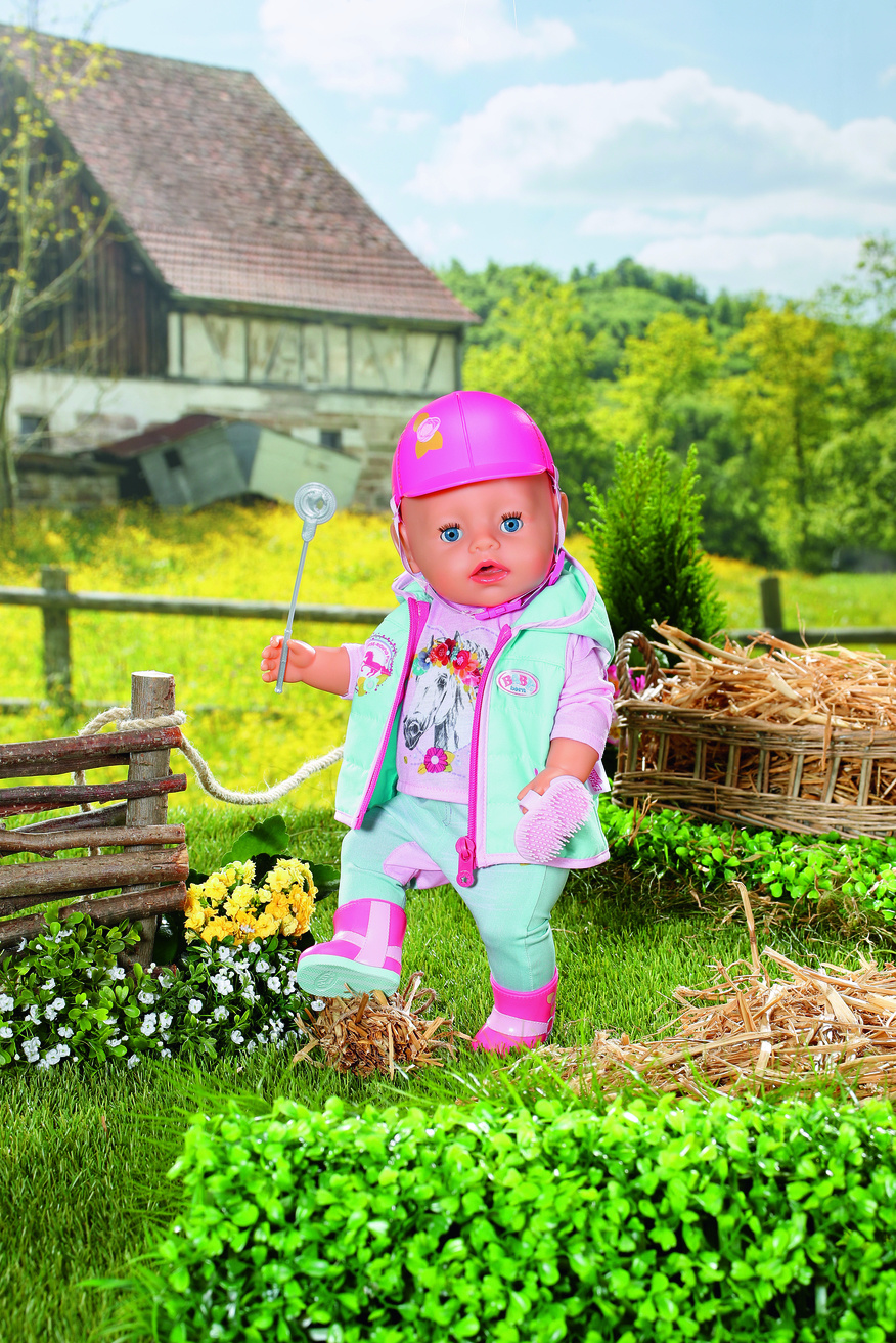 Als het tijd is voor een dressuur- of springwedstrijd dan maakt BABY born niet alleen haar schattige paardje mooi, maar ook zichzelf. In haar turkoois-roze outfit ziet ze er supertrendy uit op haar lichtbruine pony. Het zitvlak van de paardrijbroek is ver