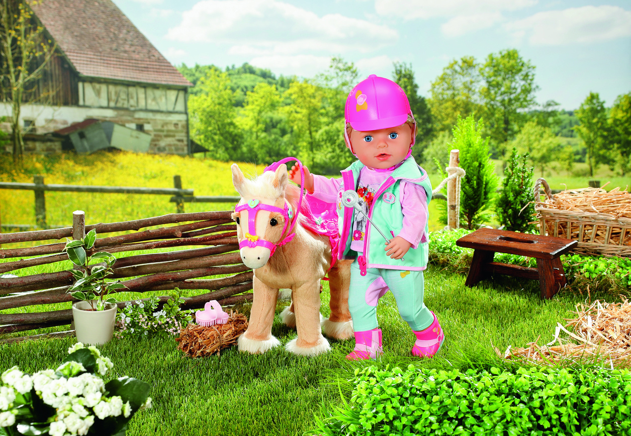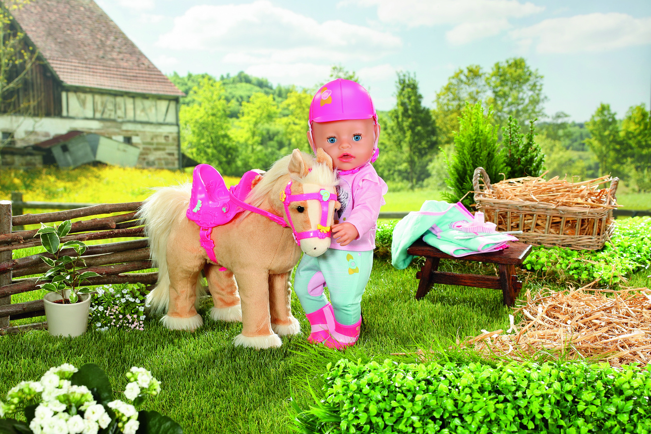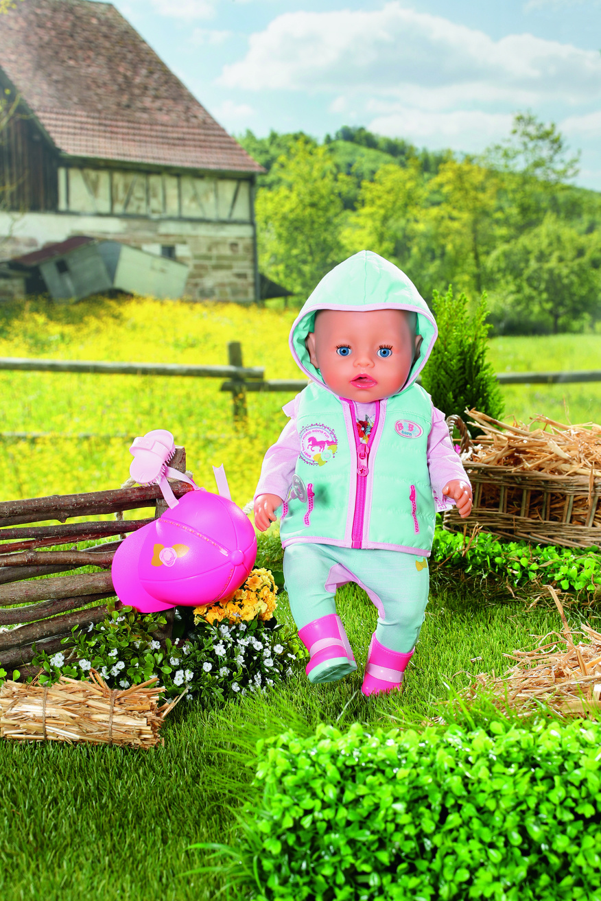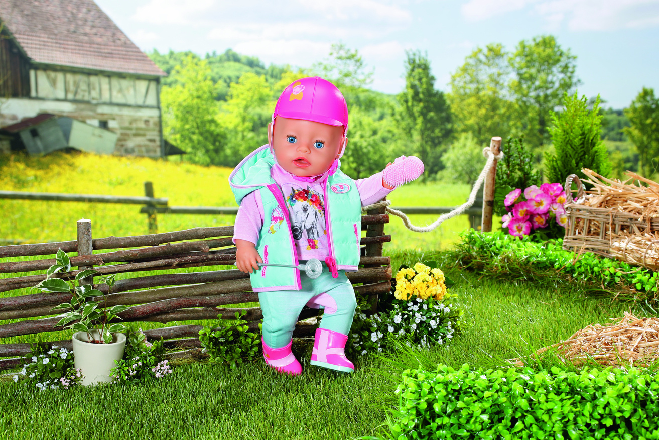 Als het tijd is voor een dressuur- of springwedstrijd dan maakt BABY born niet alleen haar schattige paardje mooi, maar ook zichzelf. In haar turkoois-roze outfit ziet ze er supertrendy uit op haar lichtbruine pony. Het zitvlak van de paardrijbroek is ver