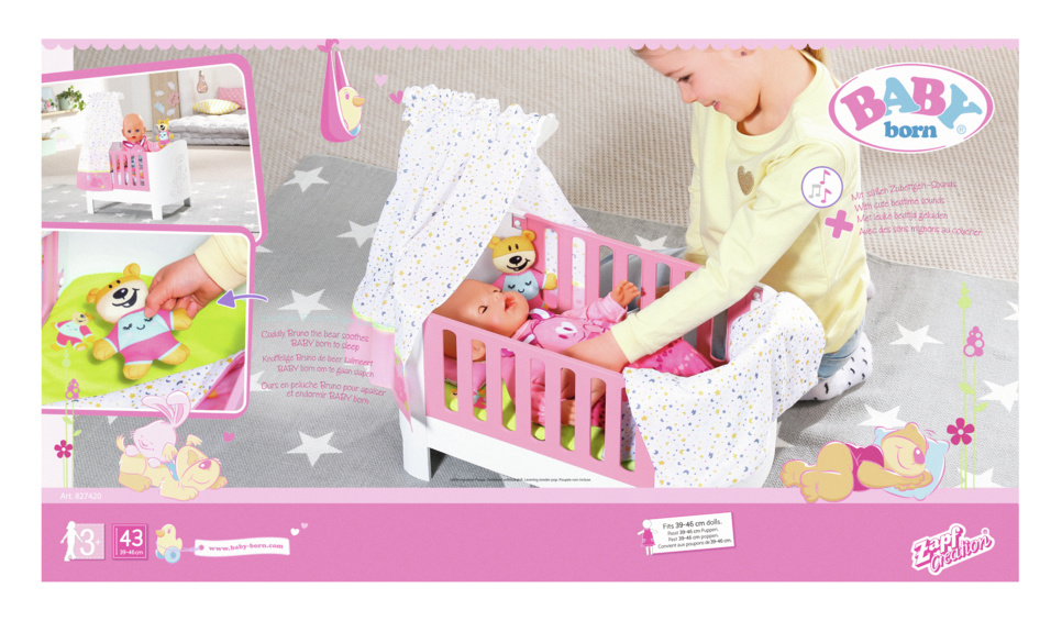 BABY born en haar zusje zijn in de hemel met dit prachtige bed. Het is gewoon magisch. Zo af en toe komt bedtijd te vroeg voor BABY born. Als je haar in bed legt met het comfortabele beddengoed, begint ze tegen te sputteren en te huilen. Maar wanneer je de knuffelige Bruno de beer naast haar zet, kalmeert ze al snel en valt ze als bij toverslag in slaap. Haar zus ligt ook graag in het comfortabele bed om de sterren erboven te tellen en te luisteren naar het slaapliedje. Je kunt de roze zijkanten verwijderen. – Kwalitatief hoogstaande accessoires voor de BABY born-pop – Voor verbeterd, gevarieerd en langdurig speelplezier BABY born Magische beddenhemel met beddengoed en knuffelspeeltje, verwijderbare zijkanten, stickers en geluidseffect. BABY born valt als bij toverslag in slaap in het comfortabele hemelbed met geluidseffecten.