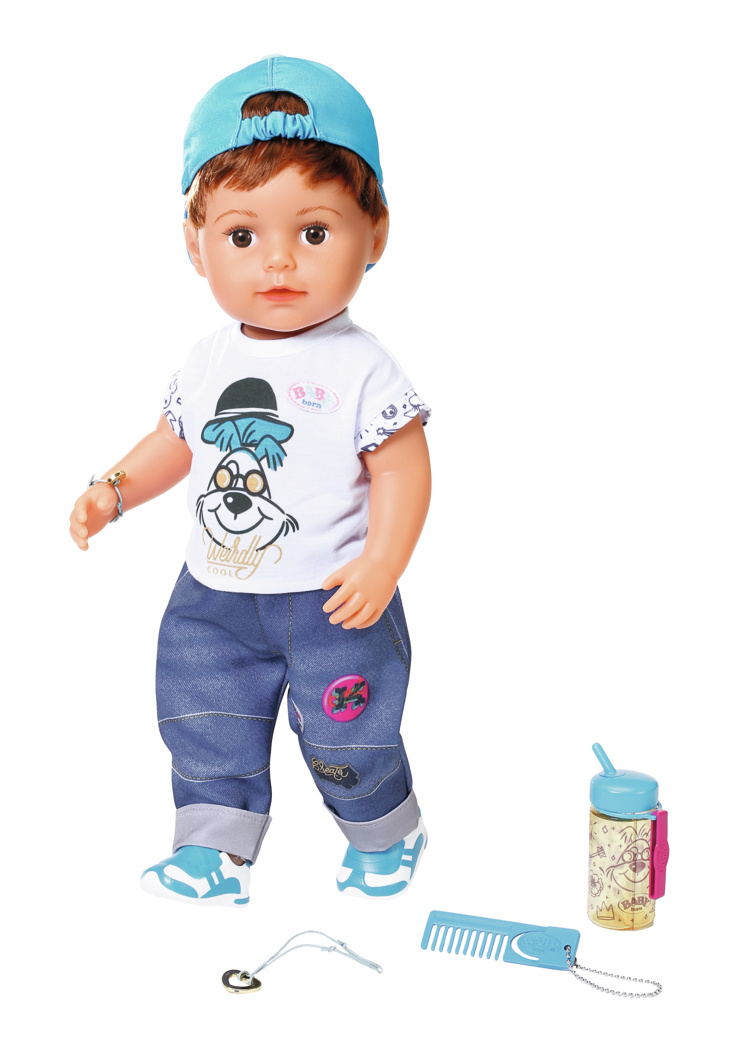 Wat is het ook een gek aapje! Het broertje heeft de haarborstel van zijn zusje weer eens gestolen, ook al heeft hij een eigen kam om zijn haar dat steeds in de war zit te kammen. Maar wie kan weerstand bieden aan zijn ondeugende snoetje en snode bruine ogen? De jongen met Soft Touch-lijfje is altijd druk bezig. Zijn flexibele knieën en stijlvolle sneakers brengen hem naar elke plek waar hij heen wil, hij stopt alleen af en toe om te drinken uit zijn flesje. Hij draagt graag een spijkerbroek en een wit T-shirt met grappige Bello de hond-print. Zijn pet draagt hij achterstevoren, zoals het hoort. Het kan nogal wat moeite kosten om hem zijn pet af te laten zetten, soms moet hij daar ook van huilen. Maar alles is weer goed als hij naar het zwembad mag gaan met zijn zusjes. – BABY born Broertje – Met zes levensechte functies voor nog meer plezier – Afwisselend (rollen) spel met BABY born stimuleert de verbeelding en is een bewezen ondersteuning van sociale vaardigheden zoals verantwoordelijkheid, communicatie en empathie – Geen batterijen vereist BABY born Soft Touch Brother (43 cm) met shirt, broek, schoenen en pet. Inclusief drinkflesje, kam en 1 vriendschapsarmband elk voor het kind en de pop. Het BABY born-broertje heeft zes functies en vier accessoires bij zich.