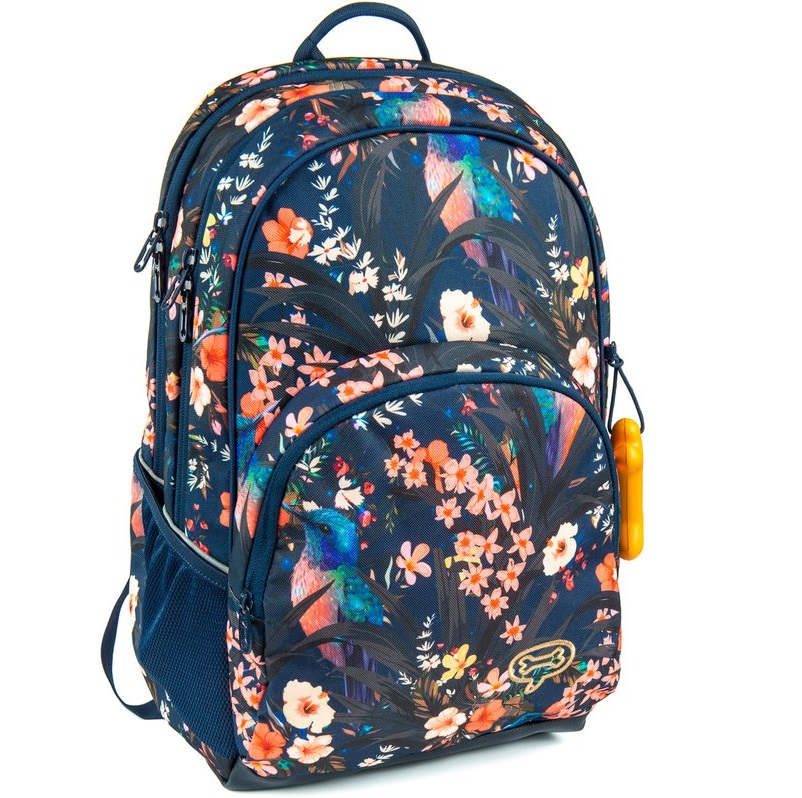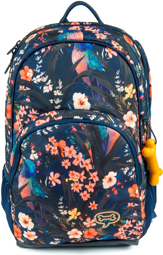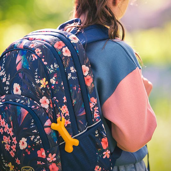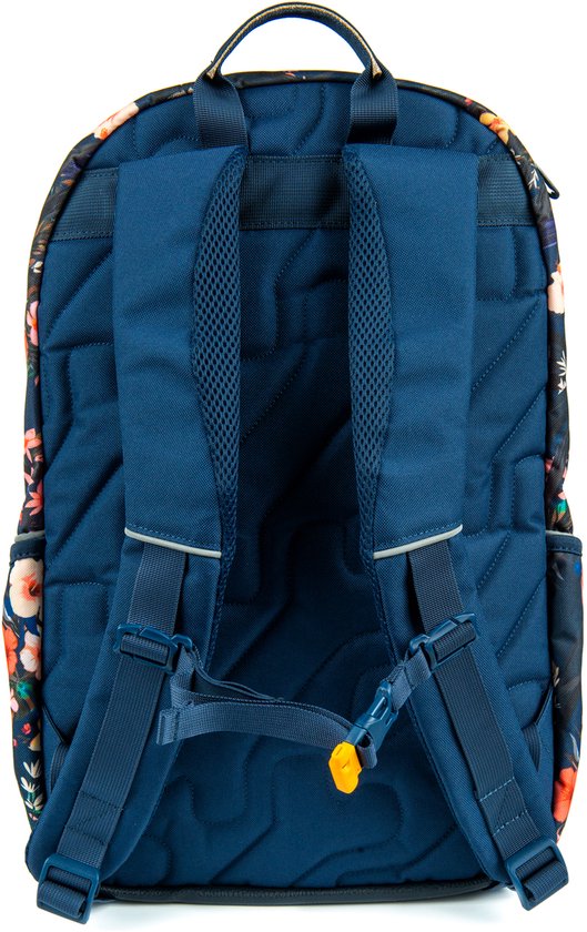 Rugzak Aspen Blossoms Indigo is een grote, ruime en vooral zeer praktische rugzak geschikt vanaf het derde leerjaar. Deze kinderrugzak beschikt over twee grote gescheiden compartimenten met ritssluiting. Één daarvan bevat een apart gewatteerd opbergvak voor je laptop en het andere compartiment heeft binnenin een naametiket en extra kleine vakken en een zakje met ritssluiting. Verder heeft deze rugzak een ruim voorvak met ritssluiting en extra kleine vakjes met een musketonhaak voor sleutels. Dankzij de 2 elastische zijvakken neem je makkelijk een drinfkfles en andere kleine spullen mee. De 2 verstelbare en gewatteerde schouderriemen en het gewatteerde rug paneel zorgen voor extra draagcomfort. Verder is deze rugzak afgewerkt met subtiele reflecterende banden voor extra veiligheid in het verkeer. De onderkant is afgewerkt met een verstevigde bodem waardoor deze rugzak tegen een stootje kan. Een super handige rugzak voor een hele dag school of om op pad te gaan!