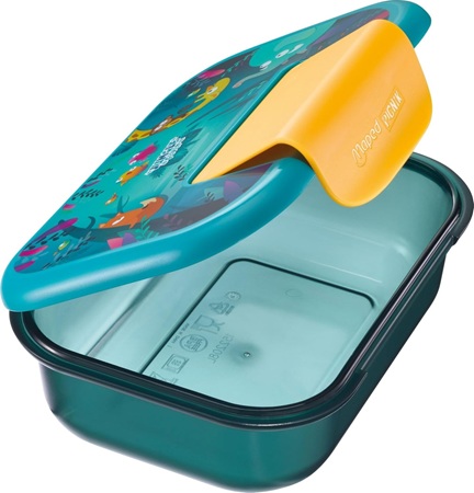 Roestvrijstalen doos met kunststofddeksel. Siliconen afdichting in deksel. Veilige clipssluiting. Luchtdicht en lekvrij design. Geschikt voor levensmiddelen. Vaatwasmachinebestendig. Afmetingen: breedte 185 mm, diepte 145 mm, hoogte 60 mm. (874199)