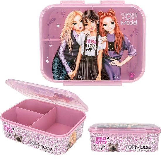 Panter power! De lichtpaarse TOPModel broodtrommel Rebel Kitty heeft op de zijkanten een trendy panterprint en elegante afbeeldingen van modellen en schattige kittens. De deksel heeft ook een afbeelding van drie grote modellen.