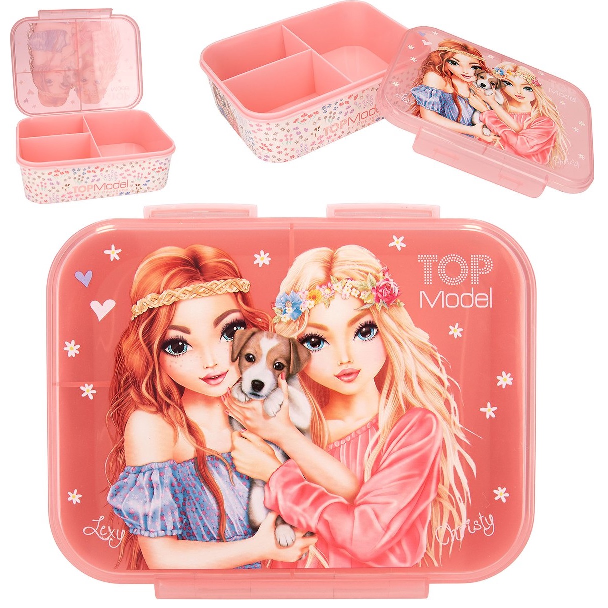 Een broodtrommel, drie aparte vakken, een transparante deksel en heel veel van de unieke TOPModel stijl. In zacht roze met kleine bloemetjes, schattige hondjes en coole modellen.