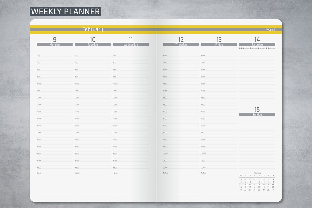 2 pagina = 1 week met verticale indeling (EN).