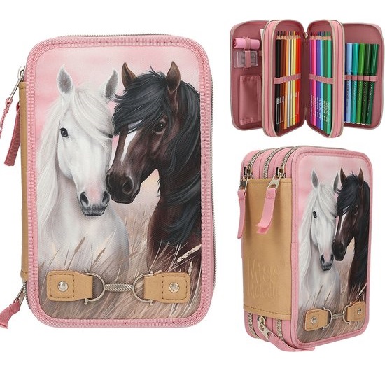 Voor paardenfans: het oudroze etui van Miss Melody heeft een ponytastische afbeelding van twee paardenhoofden op de voorkant en een aan een hoofdstel doen denkende gouden siersluiting. Met bruin kunstleer aan de zijkant en een gevlochten hanger aan de rit