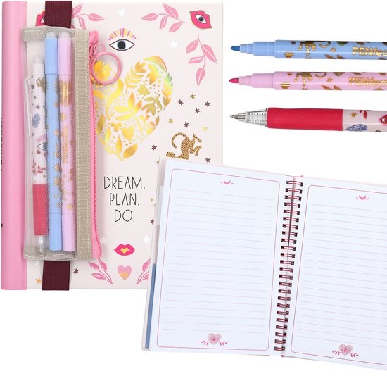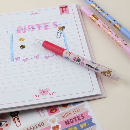 Good Karma! De schrijfset van PENfection is met zijn stijlvolle fantasy figuurtjes en florale elementen in metallic goud echt een blikvanger. De set bestaat uit een notitieboekje met een elastiek waaraan in een mapje met 2 highlighters in roze/blauw en 1 gelpen (allen uitgumbaar) zitten. Het notitieboek is van stevig karton en heeft een handige spiraalrug en gelinieerde pagina’s. Tevens zit er een leuk stickervel bij.