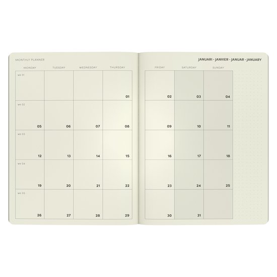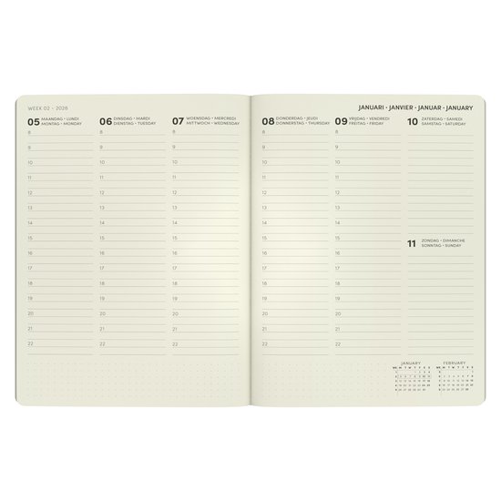 Het A5-formaat en de zachte kaft met afgeronde hoeken maken hem comfortabel om mee te nemen en te gebruiken op kantoor of onderweg. Dankzij de elastieksluiting, de degelijke genaaide binding en het hoogwaardige papier blijft alles netjes en georganiseerd.