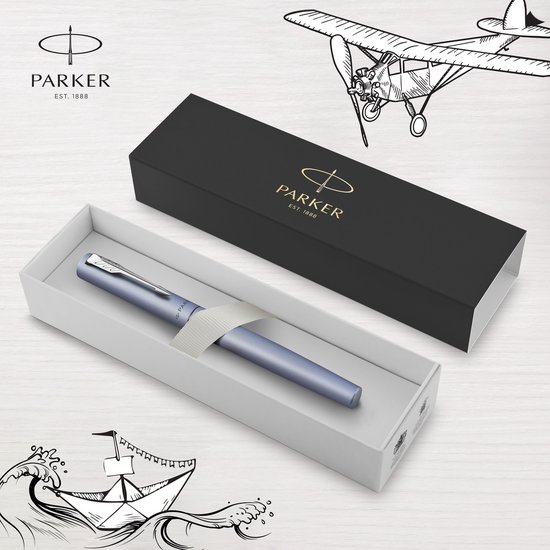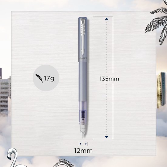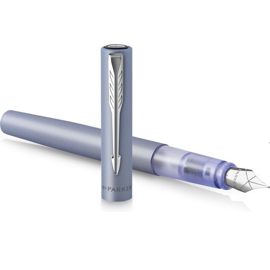 Stijlvol ontwerp ontmoet betrouwbare prestaties, de Vector XL vulpen past bij elke moderne leefstijl. De satijn-zilverblauwe metallic afwerking komt op elegante wijze samen met chroomdetails en de kenmerkende PARKER pijlclip. Met een unieke doorzichtige b