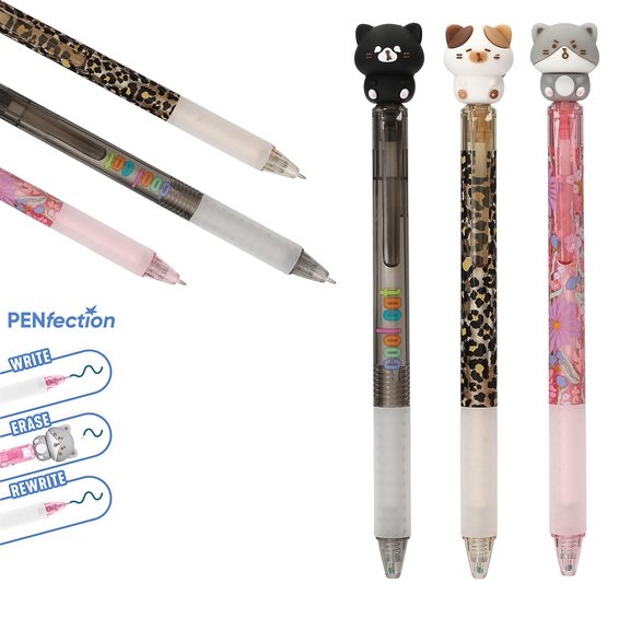 Schrijven, gummen en weer overschrijven! Geen probleem met de uitgumbare gelpennen van PENfection. De pennen hebben een schattig figuurtje van een kat als topper, die werkt als een gum (thermosensitieve blauwe inkt, die door warmte en wrijving verdwijnt).