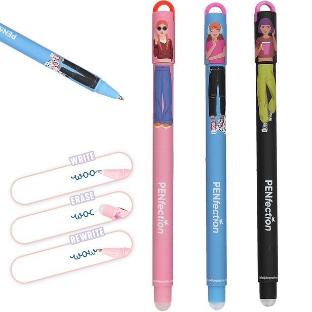 Schrijven, gummen, overschrijven: de PENfection gelpennen van TOPModel kunnen dat! En van de pen zelf word je heel blij: draai je de dop, dan verandert de look van het model. Met aangename soft touch en oogje op de dop om een kleine charm aan te hangen.